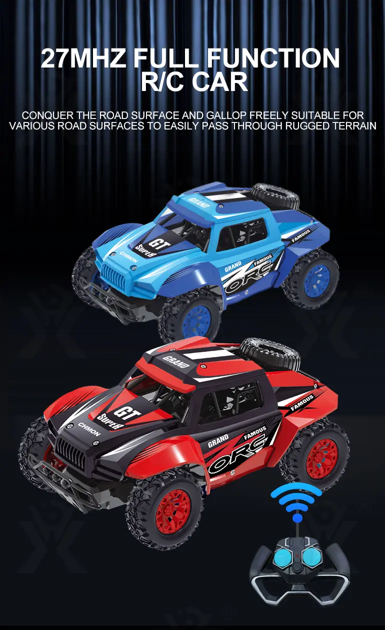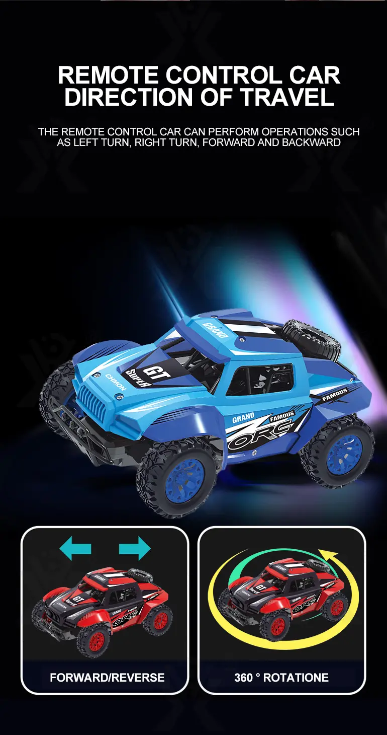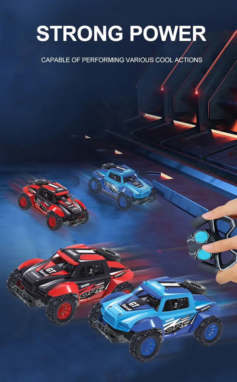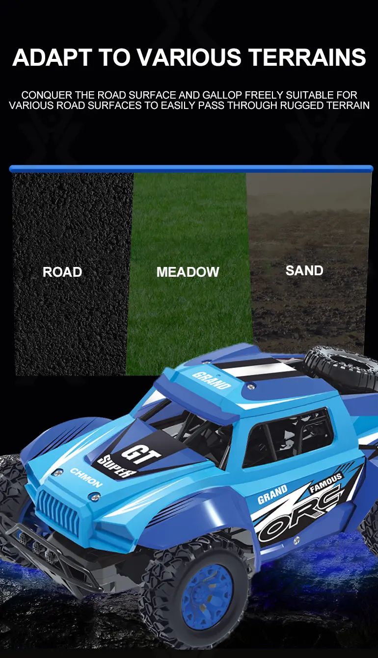 This all-terrain four-way RC car toy is designed to conquer various surfaces like roads, grass, and sand, offering versatile outdoor play.