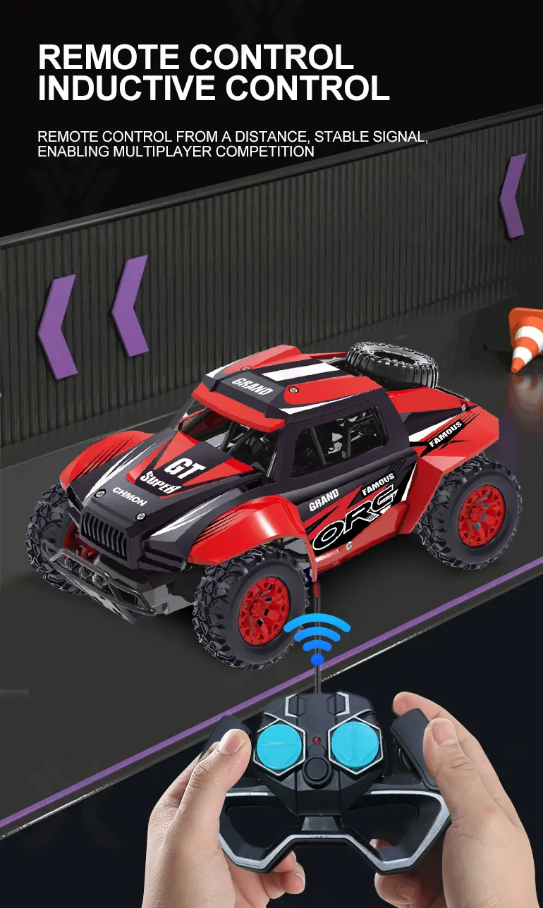 Wholesale four-way RC car toy suitable for all terrains, featuring 360° rotation, remote/inductive control, stable signal, and multiplayer racing on roads, grass, and sand.