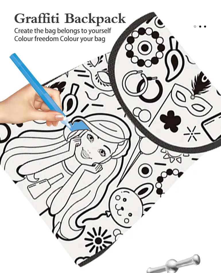Wholesale DIY graffiti backpack with washable fabric, 6 color pens, high capacity, and creative freedom for artistic expression and style.