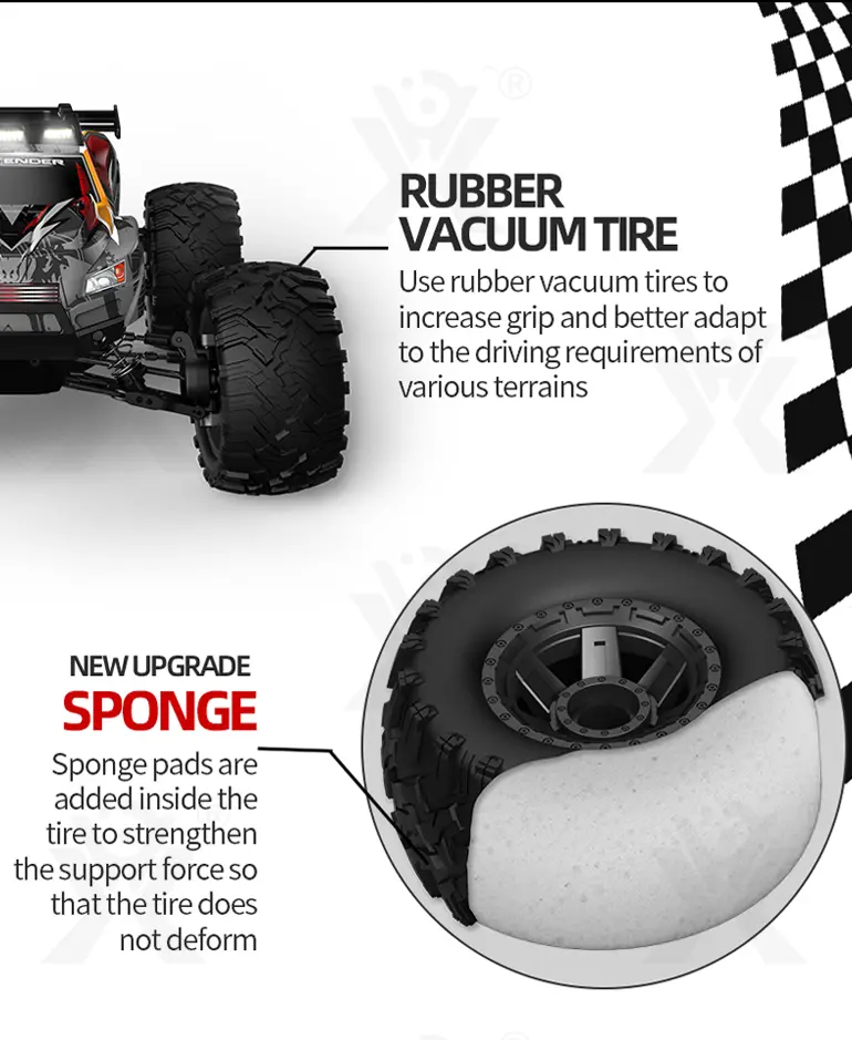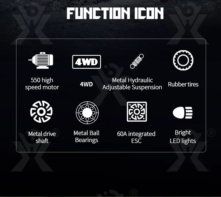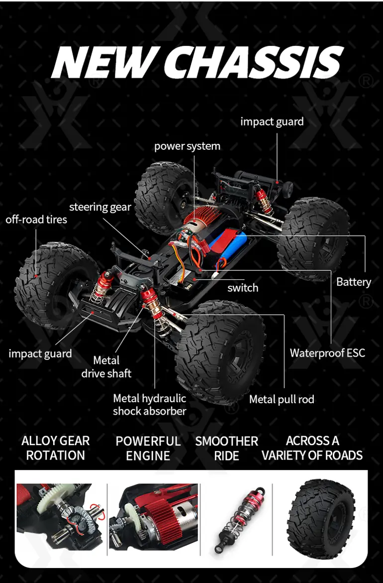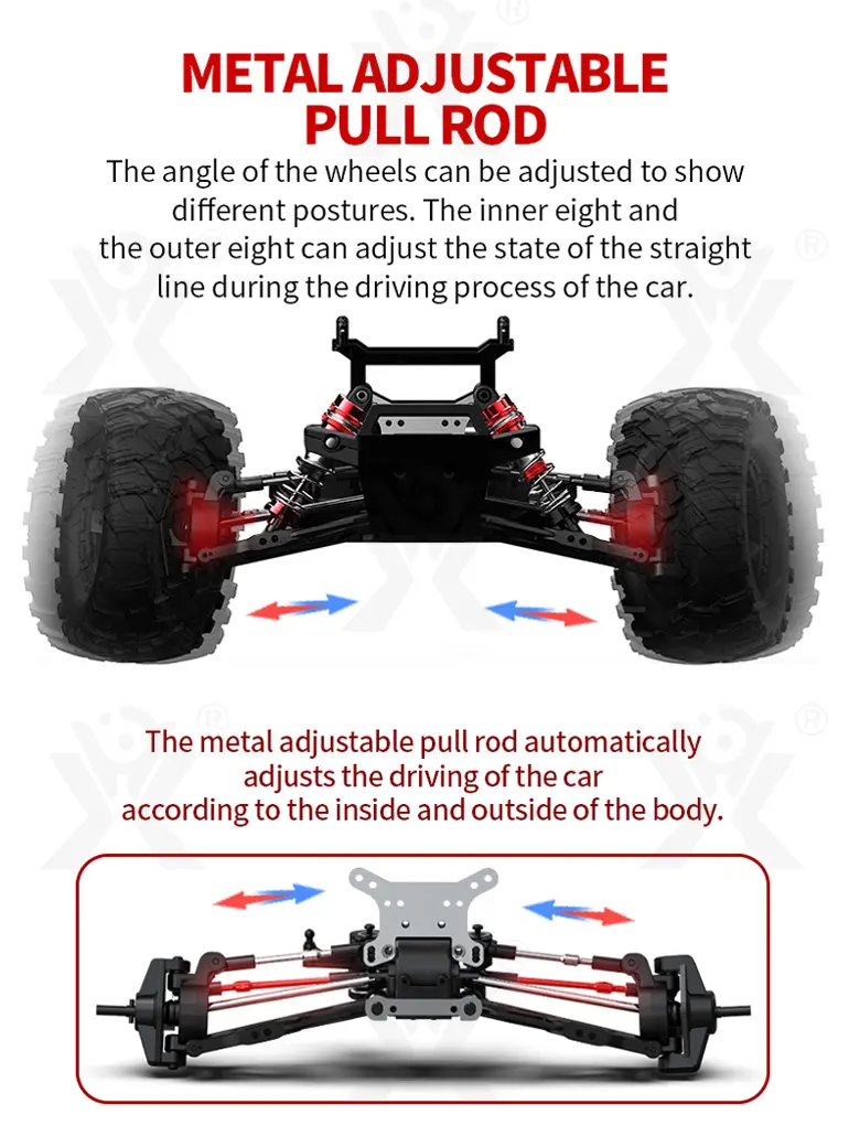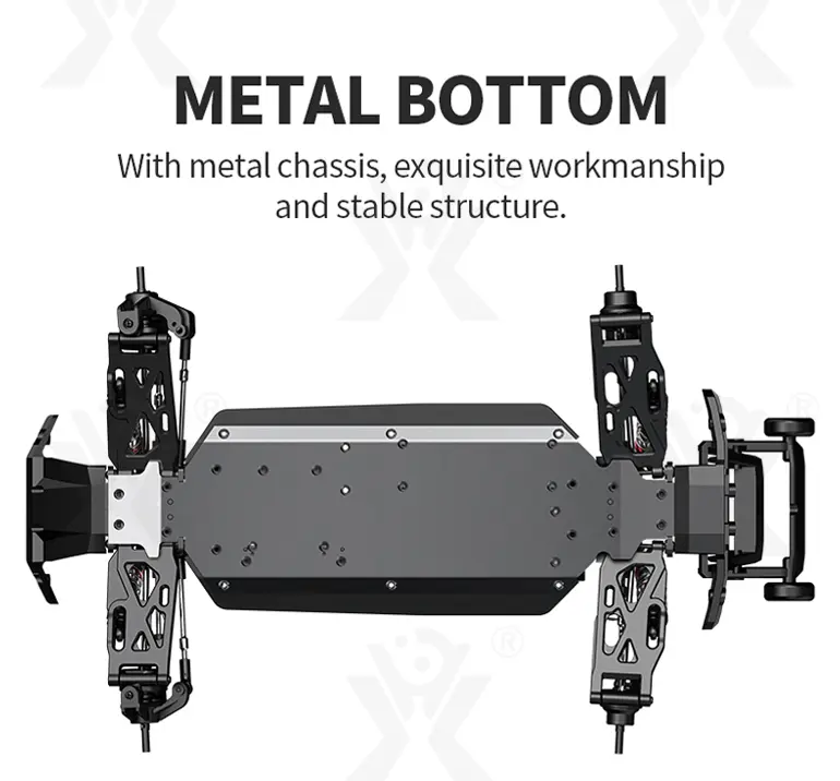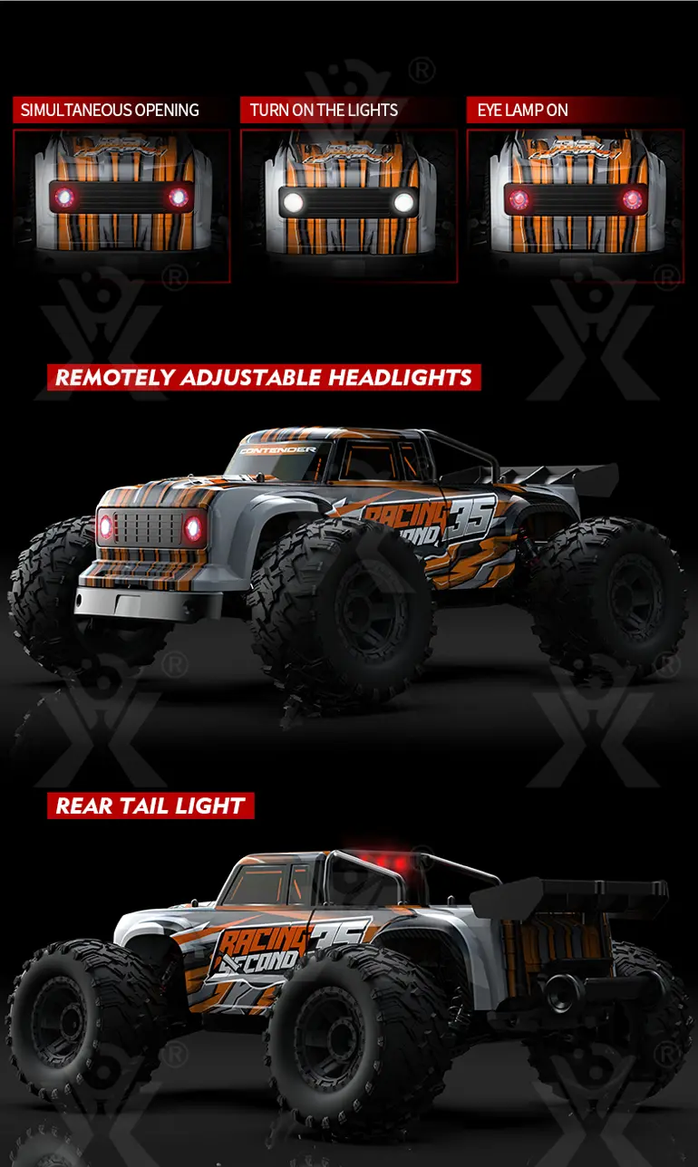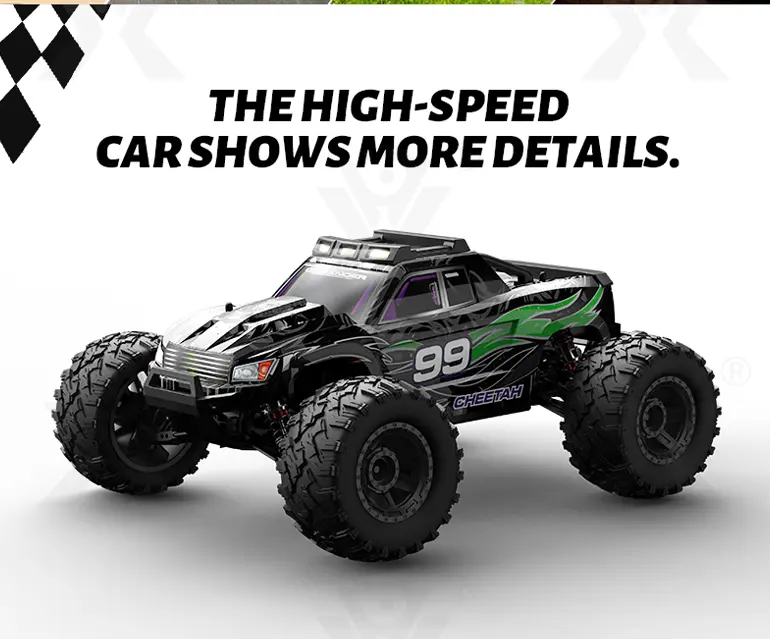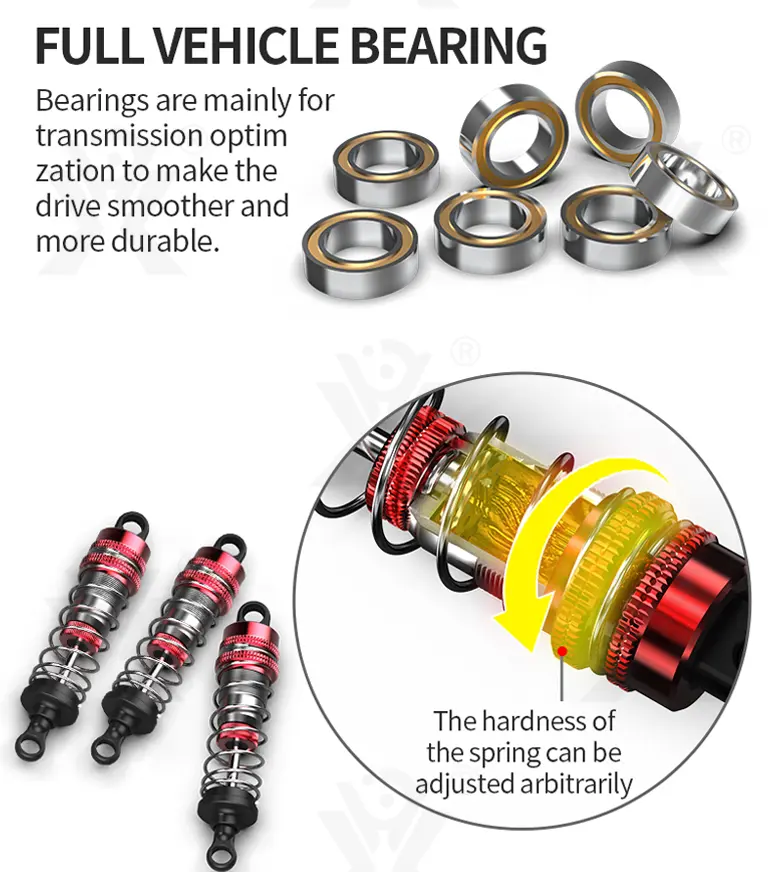 The hydraulic adjustable suspension of this high-speed truggy absorbs shocks and maintains balance, providing a smooth ride even on rough roads and prolonging vehicle life.