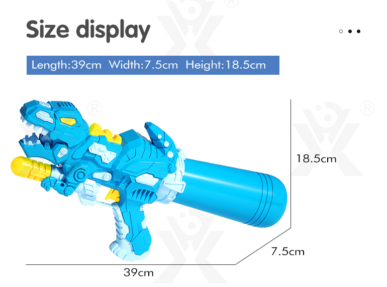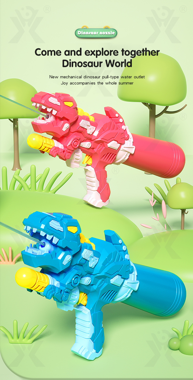 This inflatable water gun delivers summer water fun with dinosaur nozzle and pull-type inflation for 6-meter long-range shooting.