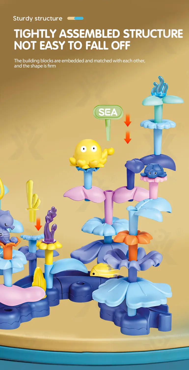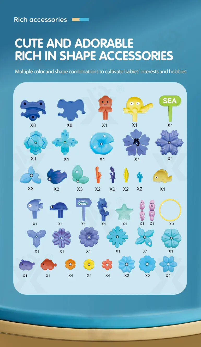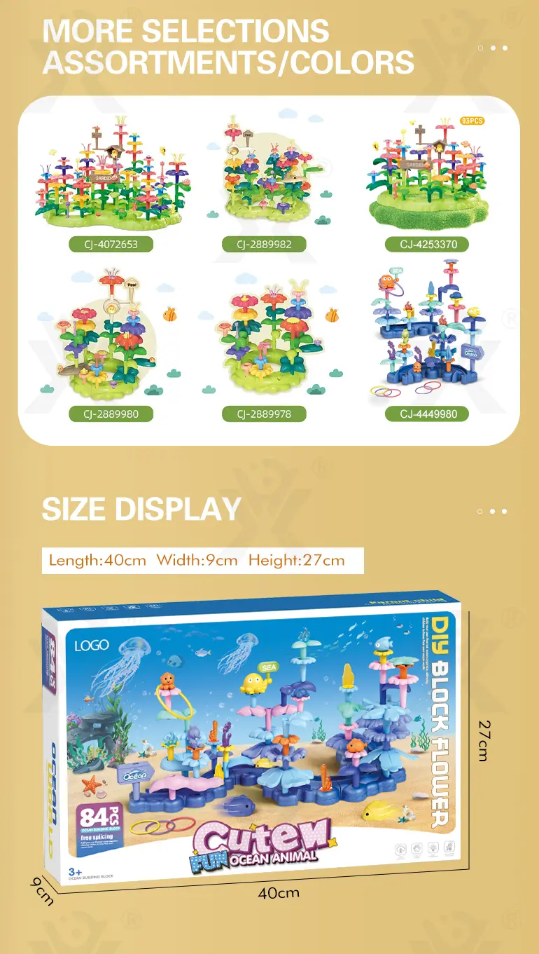 Wholesale ocean garden building blocks. It is an arrangement toy that contains ocean animals, flowers, with rich accessories—builds color & shape cognition, fine motor skills & parent-child bonding.
