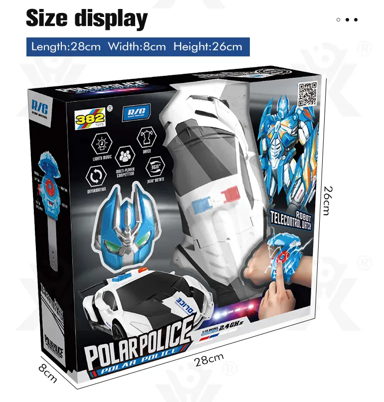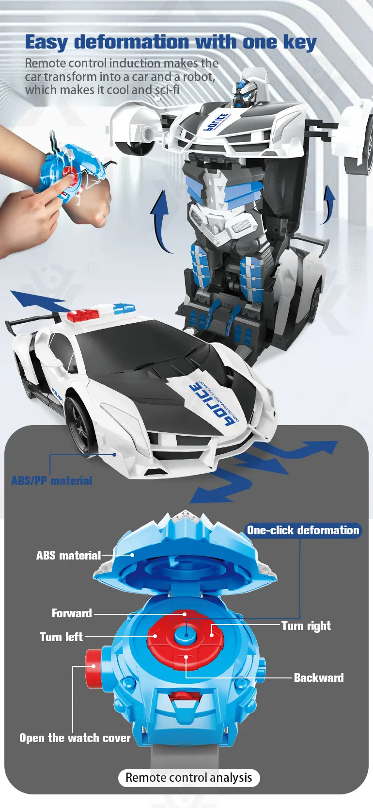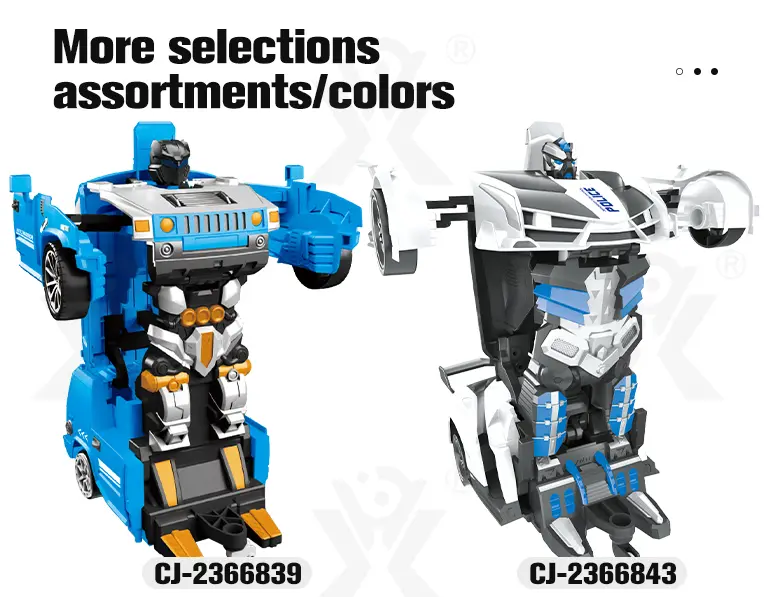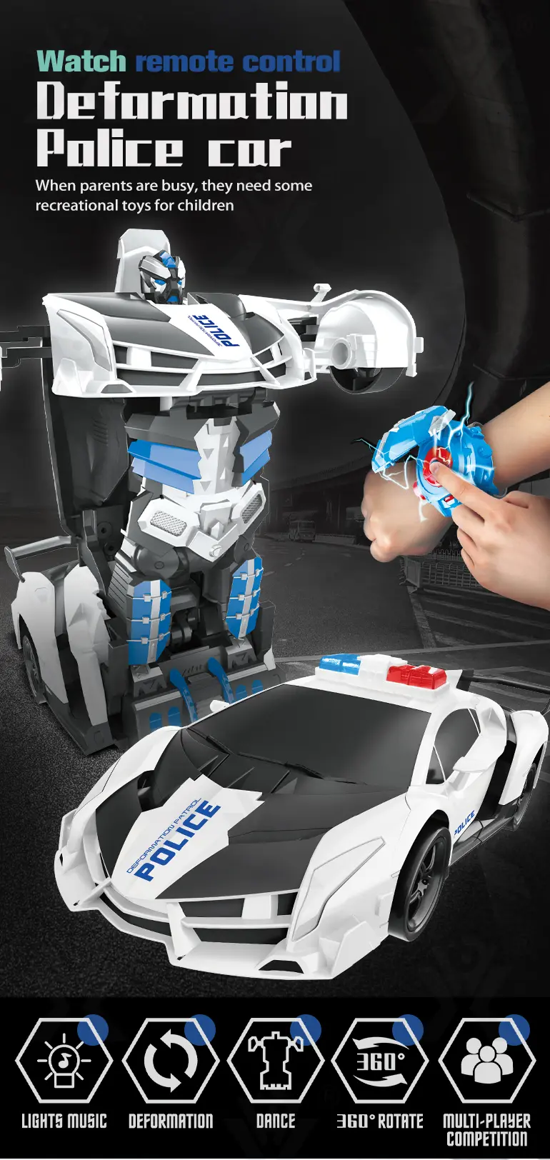 Wholesale police car transforming toy, with a one-key transformation button, RC toy! It features colorful lights, dynamic sounds & 360° rotation. Multiple play modes for an exciting transformation experience. Large-scale toy supply for factory price. Contact us now!