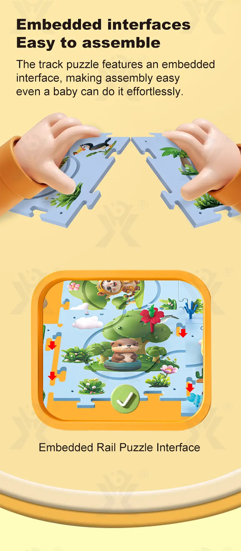 - Embedded easy-to-assemble interface: The embedded rail interface design of the puzzle racer toy is for smooth assembly, easily handled by toddlers, and develops hands-on skills