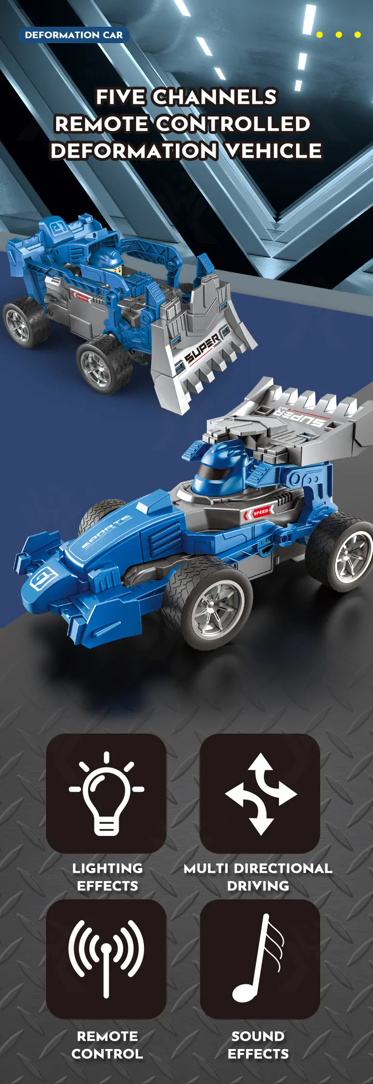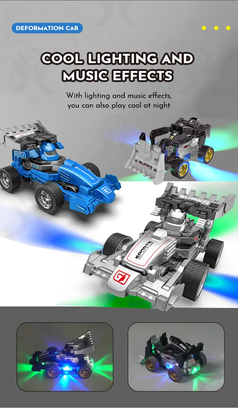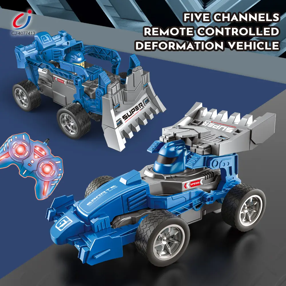 Wholesale RC deformation car toy. 5-channel remote-controlled deformation car with two modes (racing/engineering), multi-directional driving, cool LED lights, and sound effects.