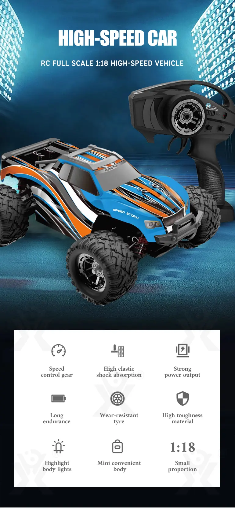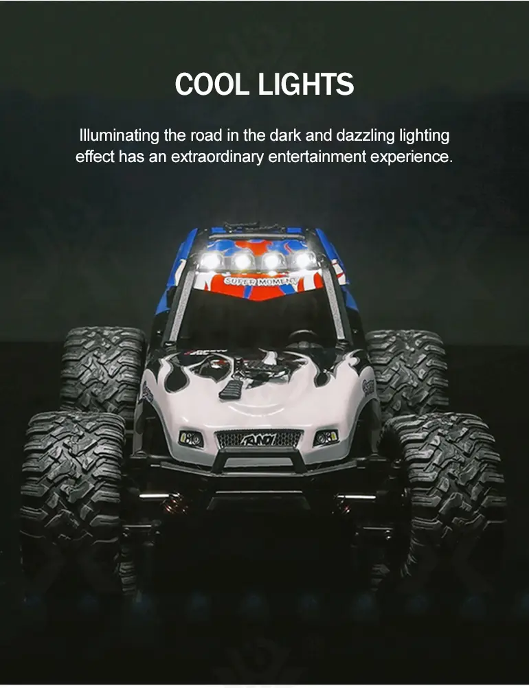 Wholesale RC monster truck toy. This 1:18 all-terrain RC monster truck toy has strong power, elastic shock absorption, wear-resistant tires, cool lights, a mini portable design, and conquers various terrains.