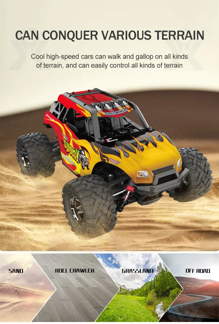Elastic shock absorbers and durable tires of the RC monster truck toy provide smooth handling on sand, grass, gravel, and rough terrain, ensuring stability and durability.