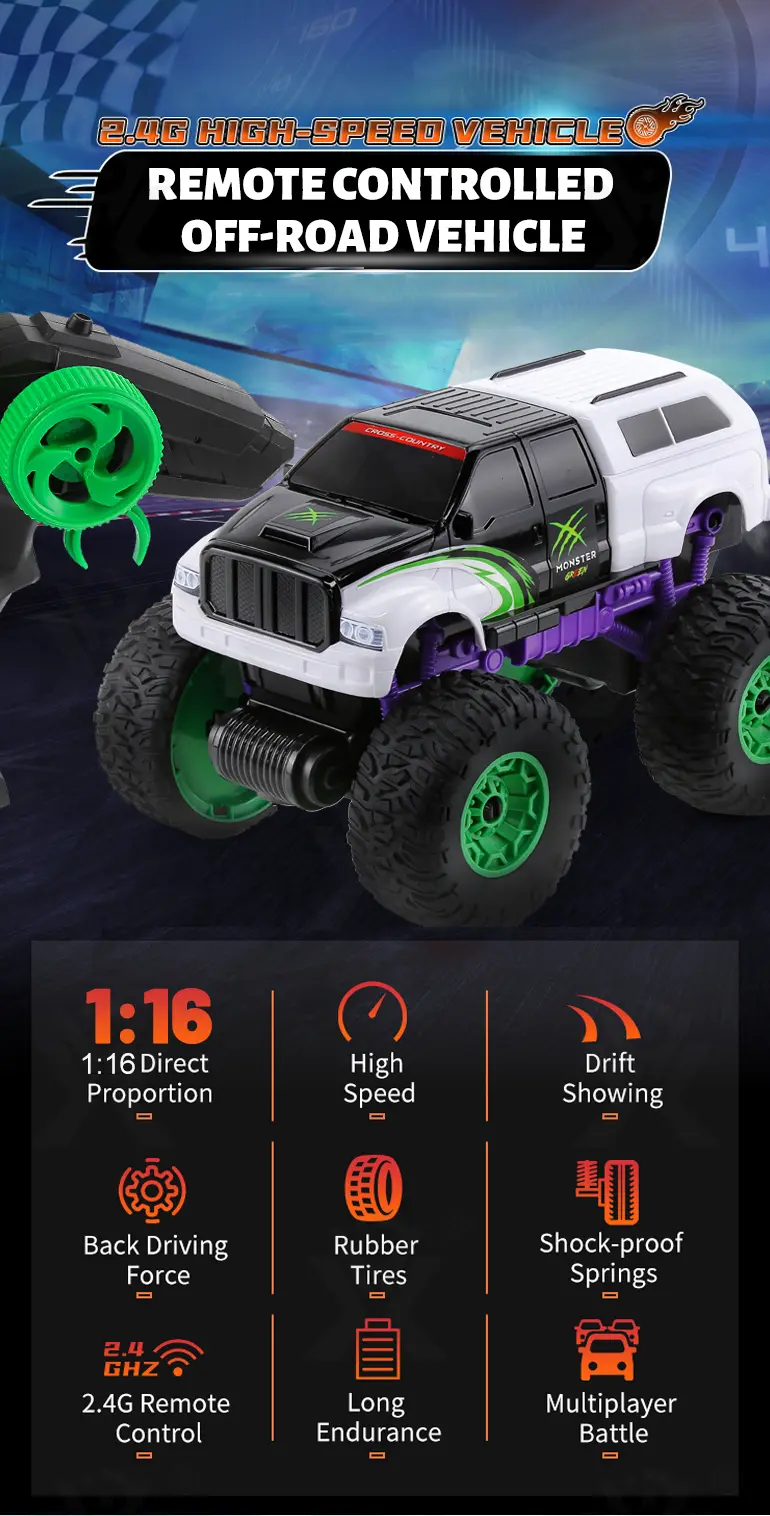 Wholesale RC off-road car. This 1:16 RC off-road vehicle toy features a 2.4GHz remote, 25m range, rubber tires, drift mode, high-speed motor, and multiplayer battle fun.