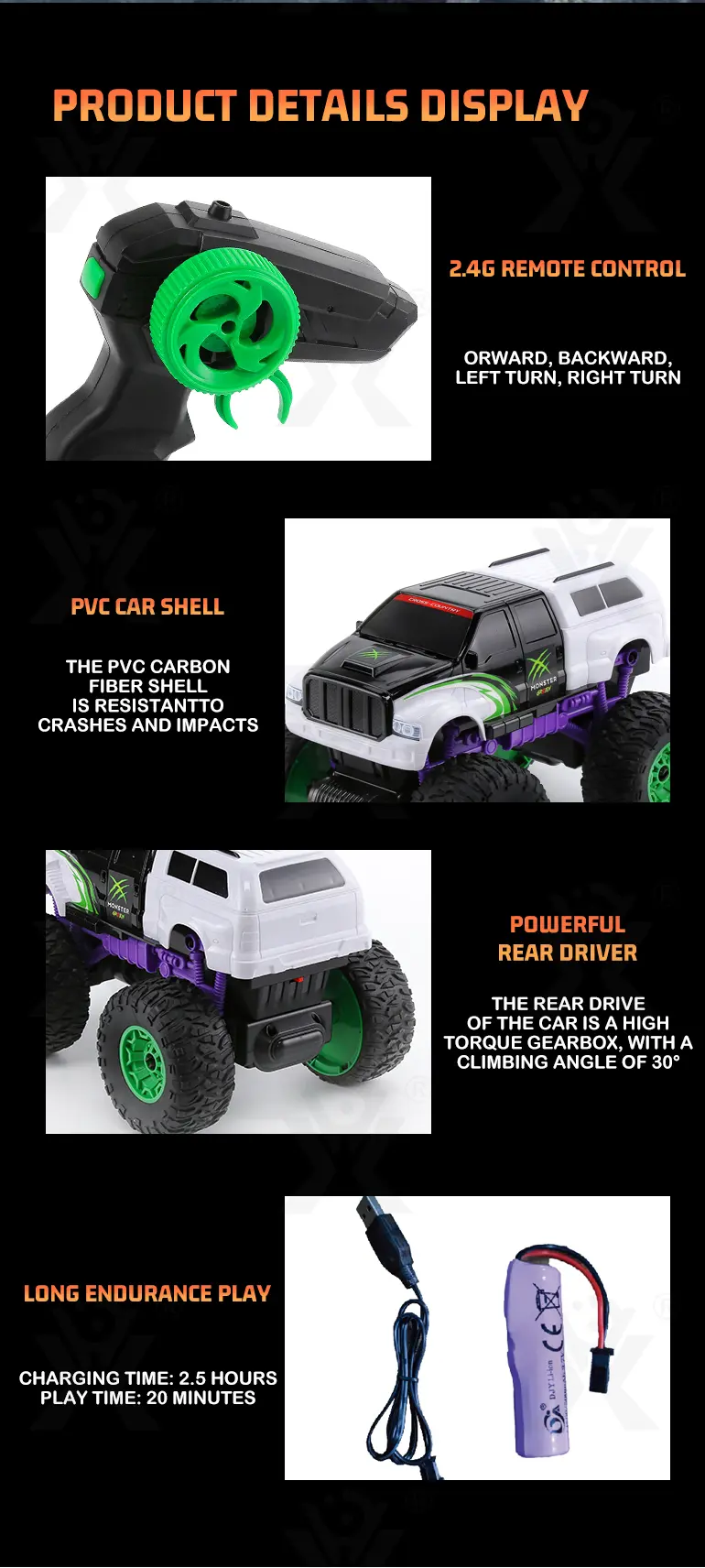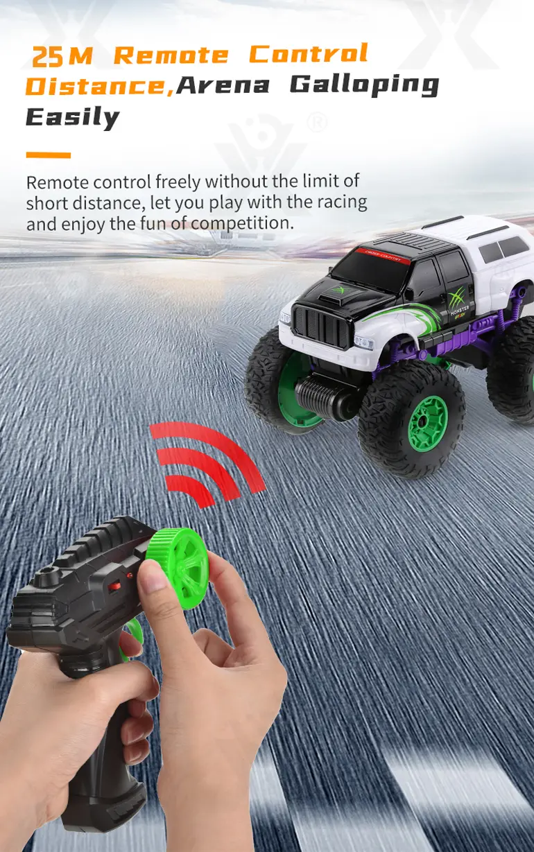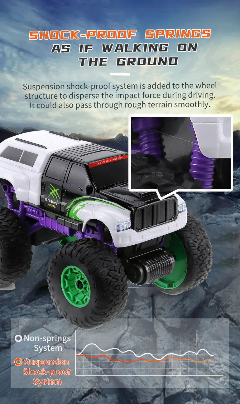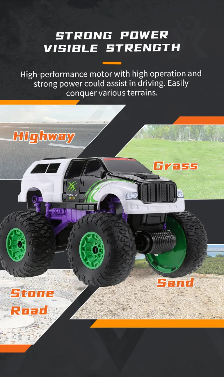 Built with shock-absorbing springs and drift-friendly tires, our RC off-road car can handle smoothly and perform stunts.