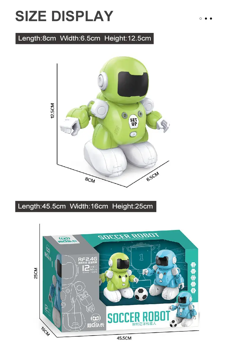 Wholesale soccer game robot with remote control. This 2.4GHz remote control soccer robot features smooth edges, safe ABS material, teamwork gameplay, and interactive parent-child competition.