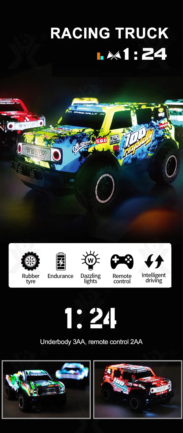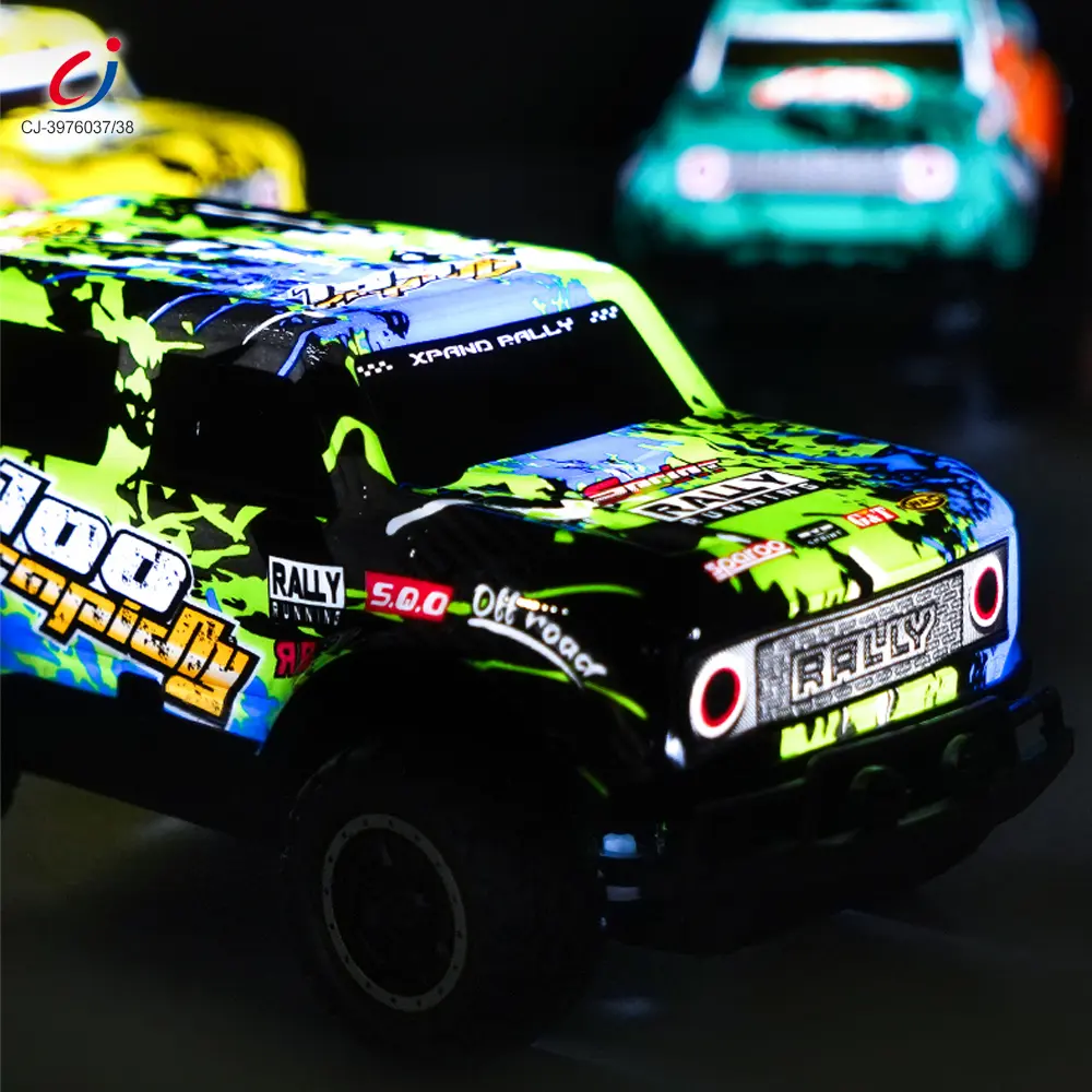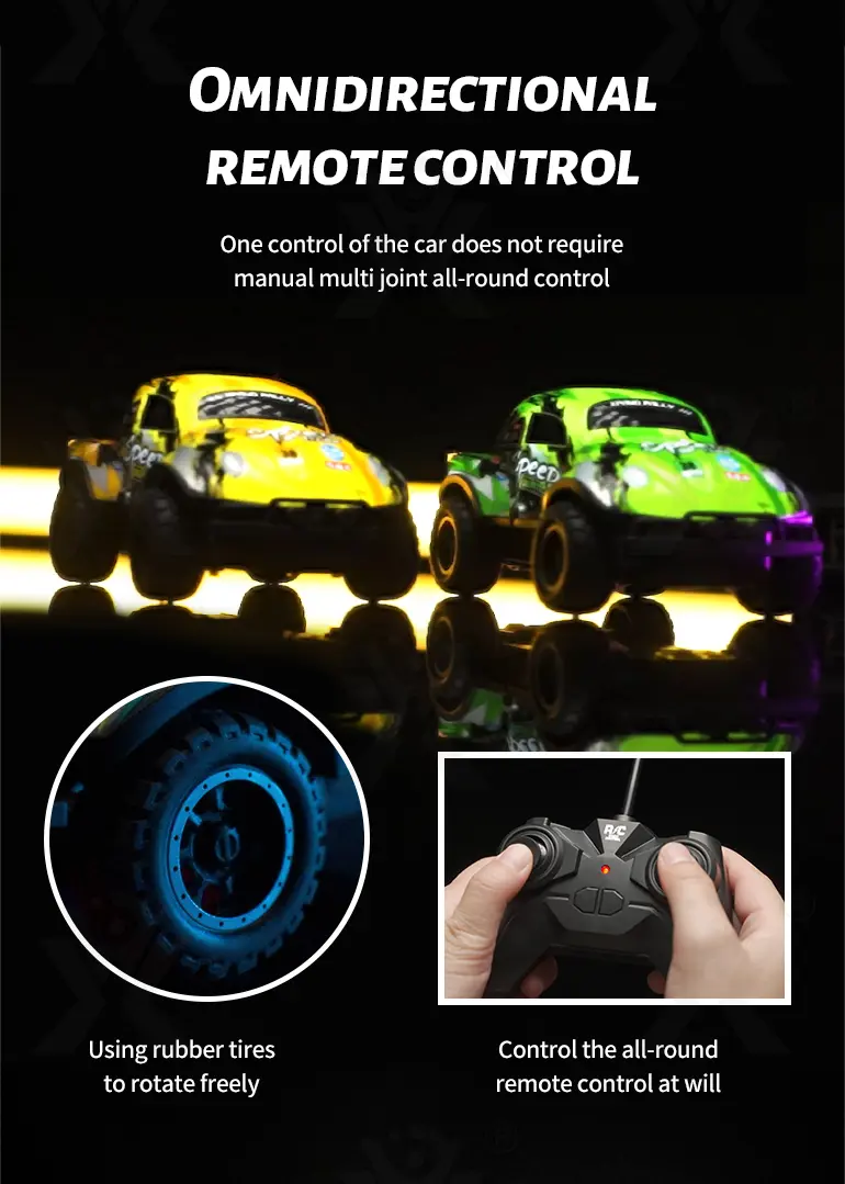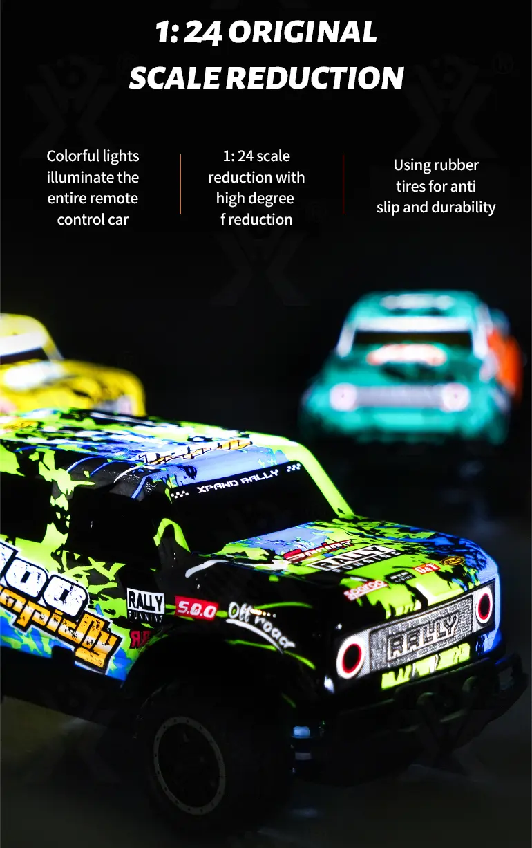 Wholesale RC SUV racing car toy. This 1:24 highly-detailed RC SUV racing car has colorful body lights, anti-slip rubber tires, and multiple styles available, suitable for all-terrain and night play.