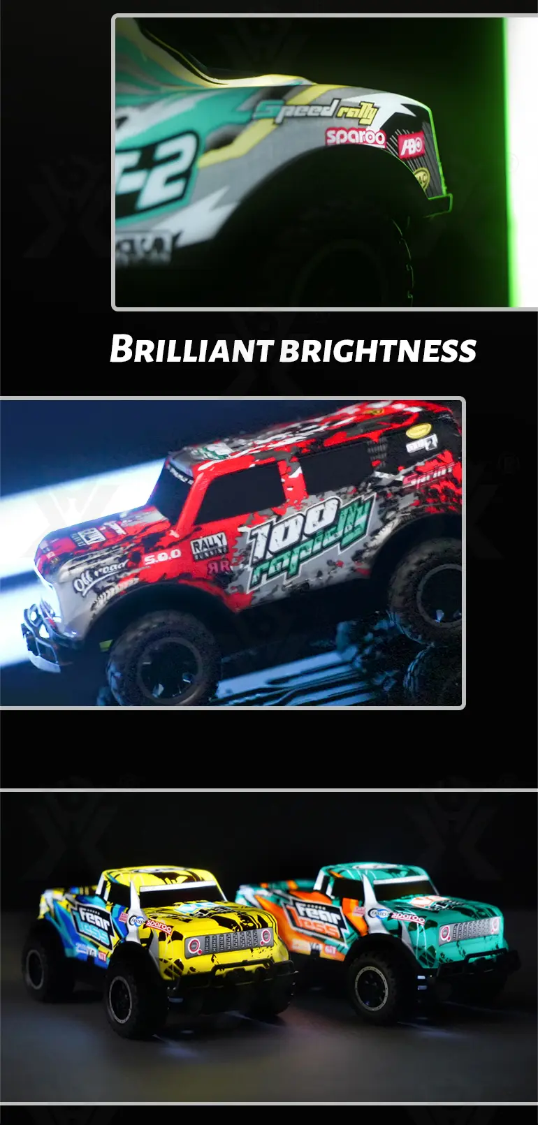 Enjoy stunning light effects with built-in colorful LEDs that illuminate the whole car, ideal for nighttime entertainment and visual appeal. -