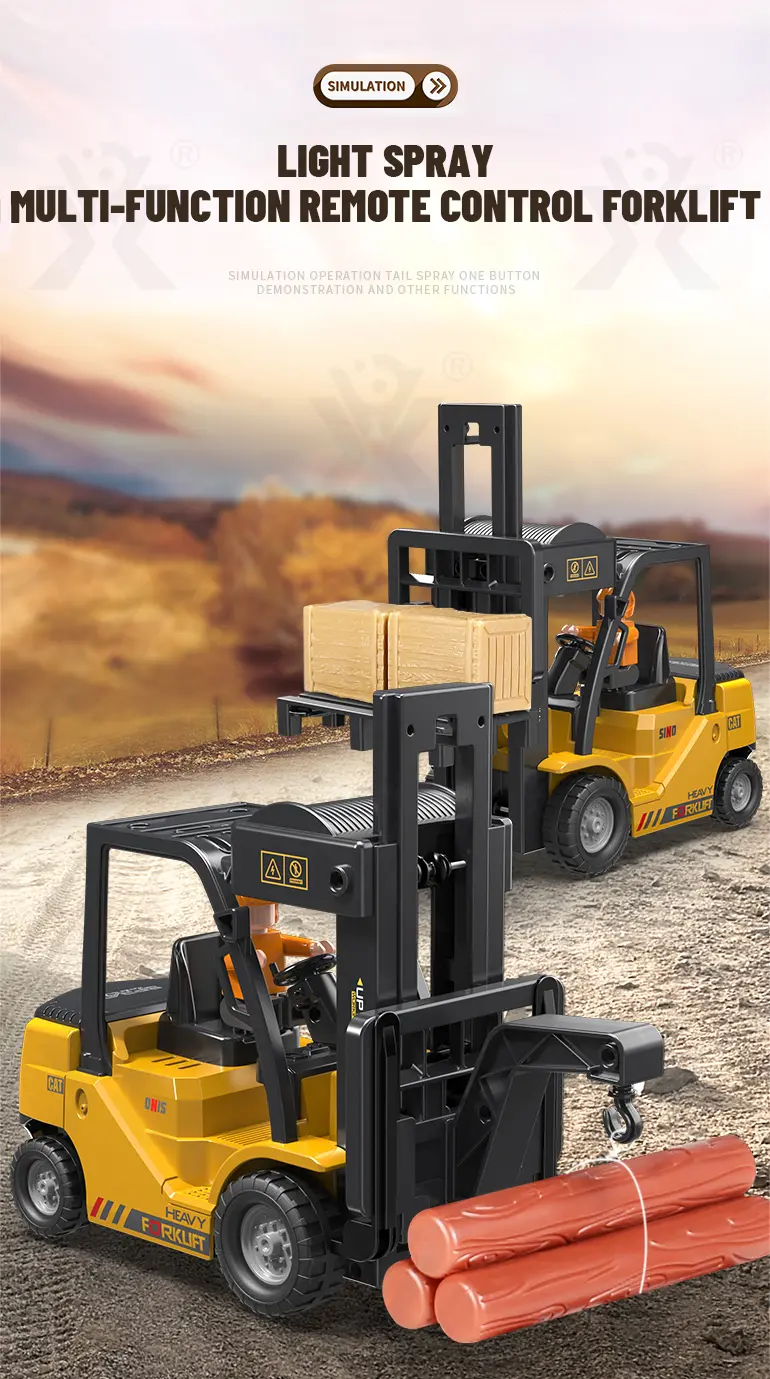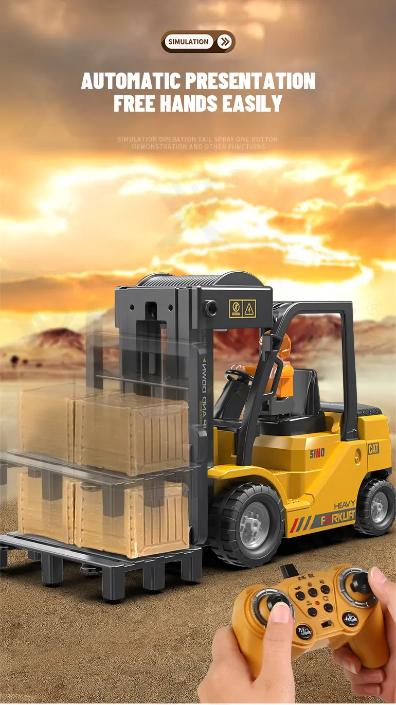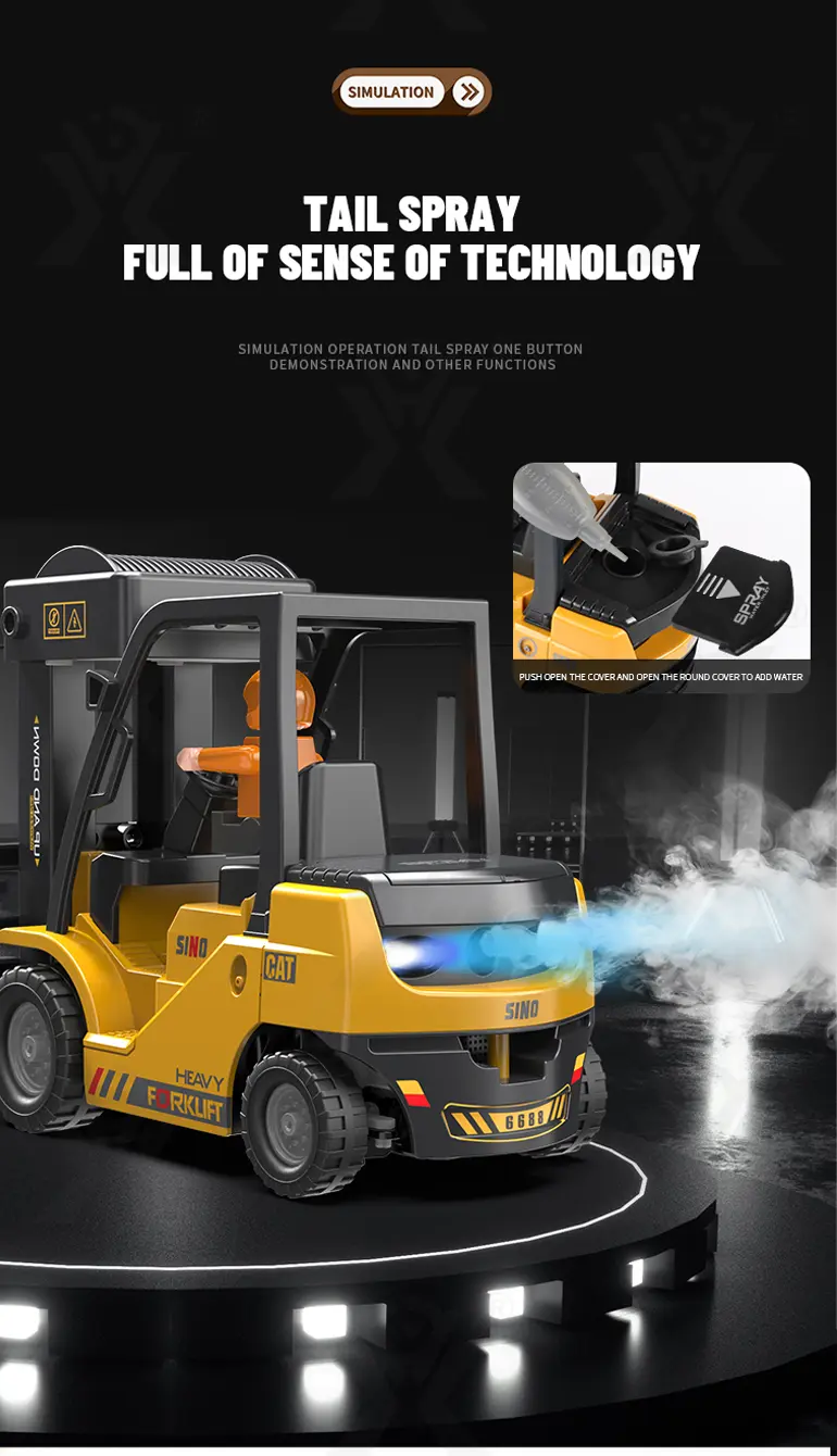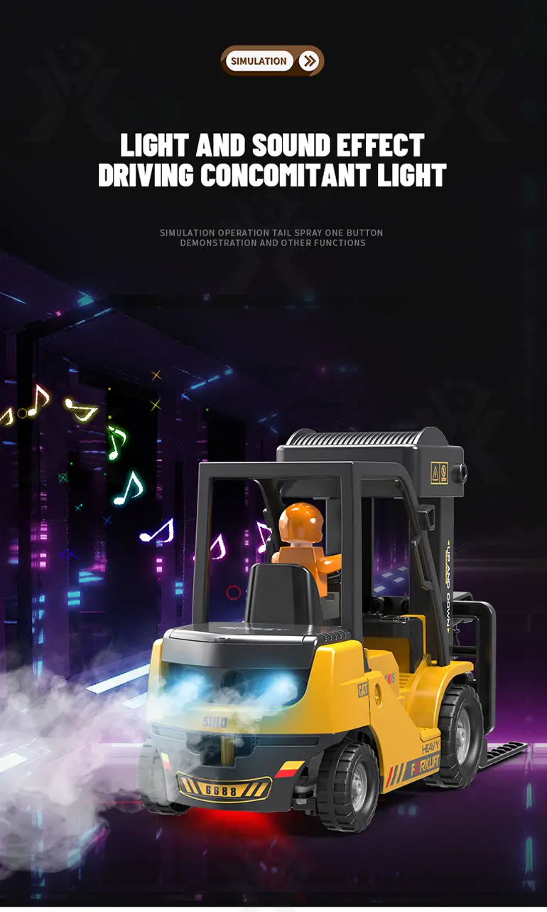 Multi-function RC heavy forklift! Lifting, simulated exhaust spray, sound/light effects & auto-demo. 2.4G remote for realistic operation fun. Chengji RC toy supplier offers you the best quote. Contact us now.