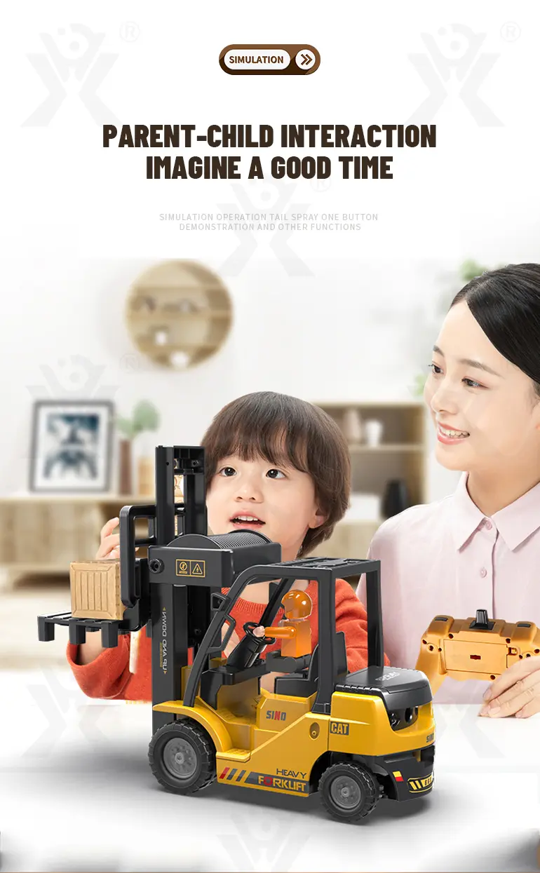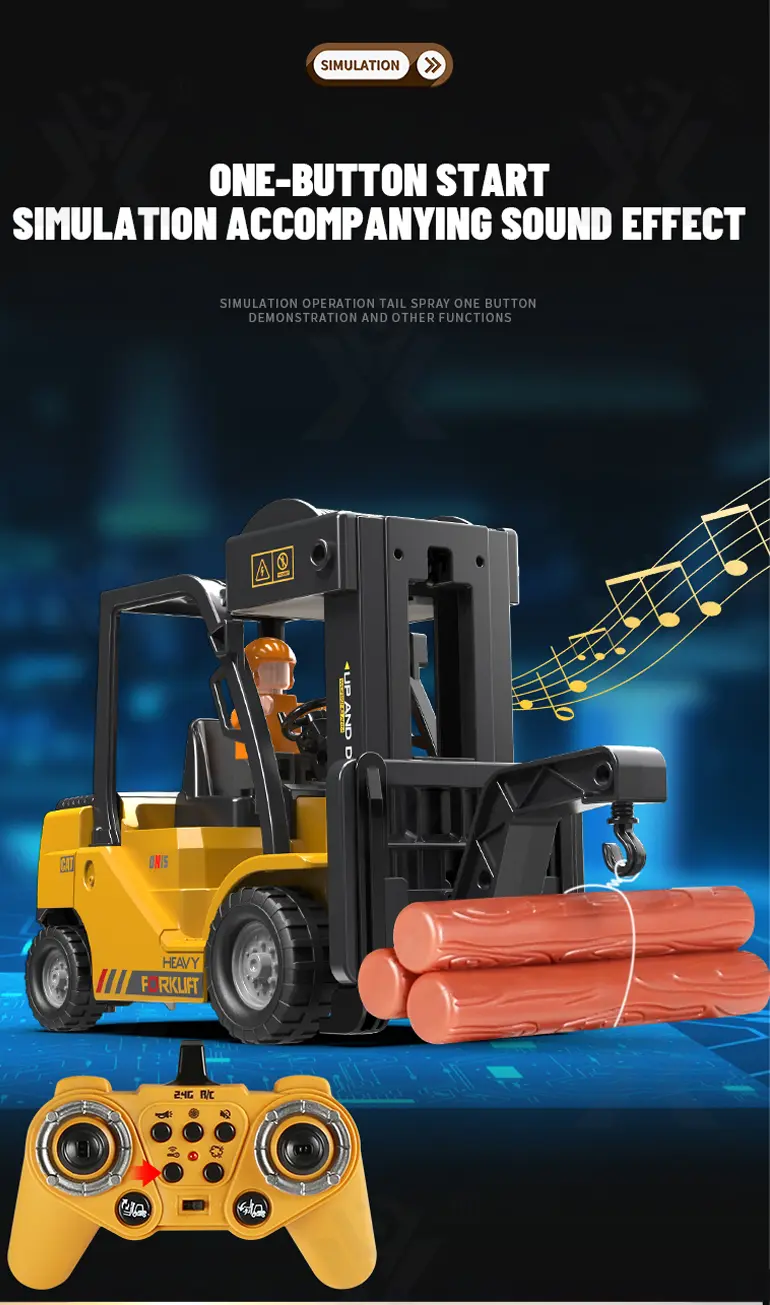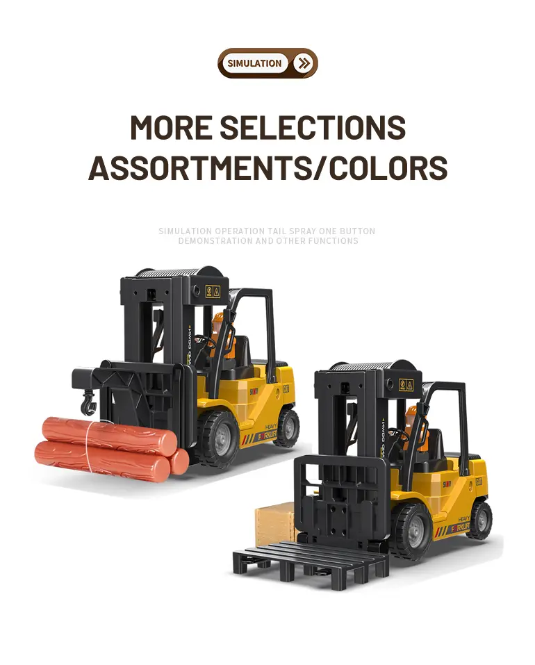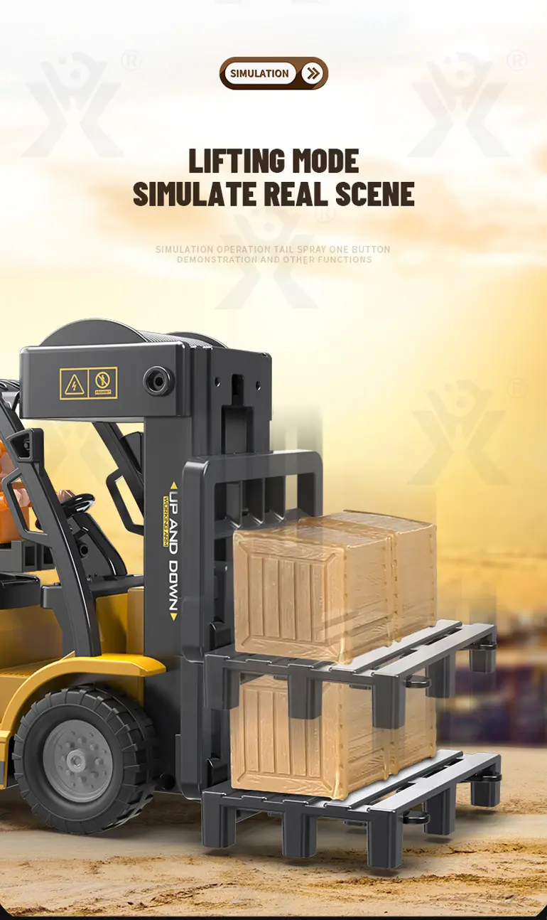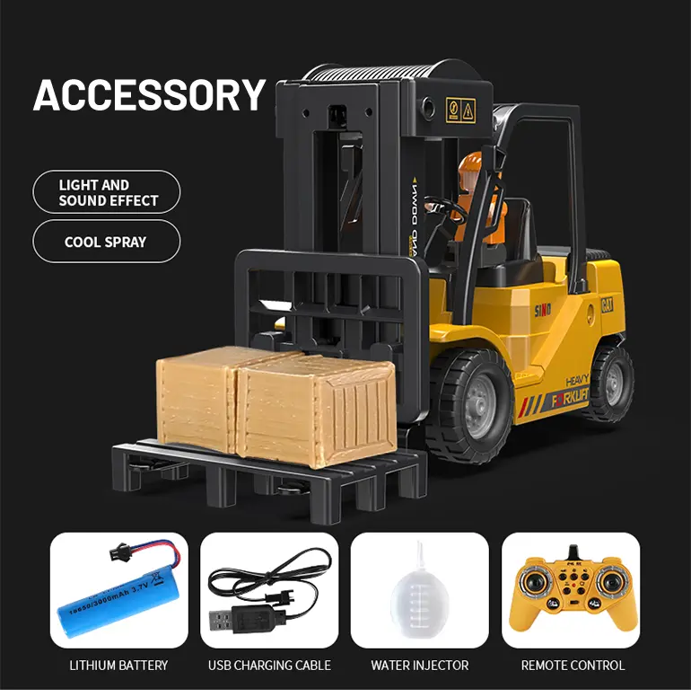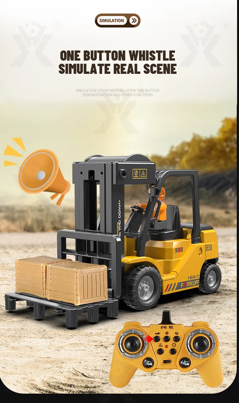 Multi-function RC heavy forklift! Lifting, simulated exhaust spray, sound/light effects & auto-demo. 2.4G remote for realistic operation fun. Chengji RC toy supplier offers you the best quote. Contact us now.