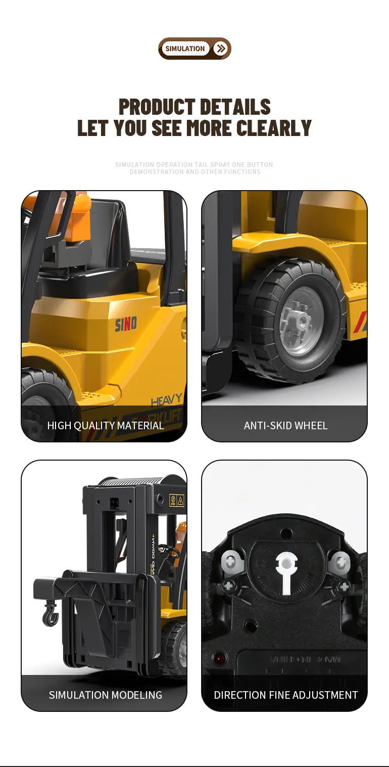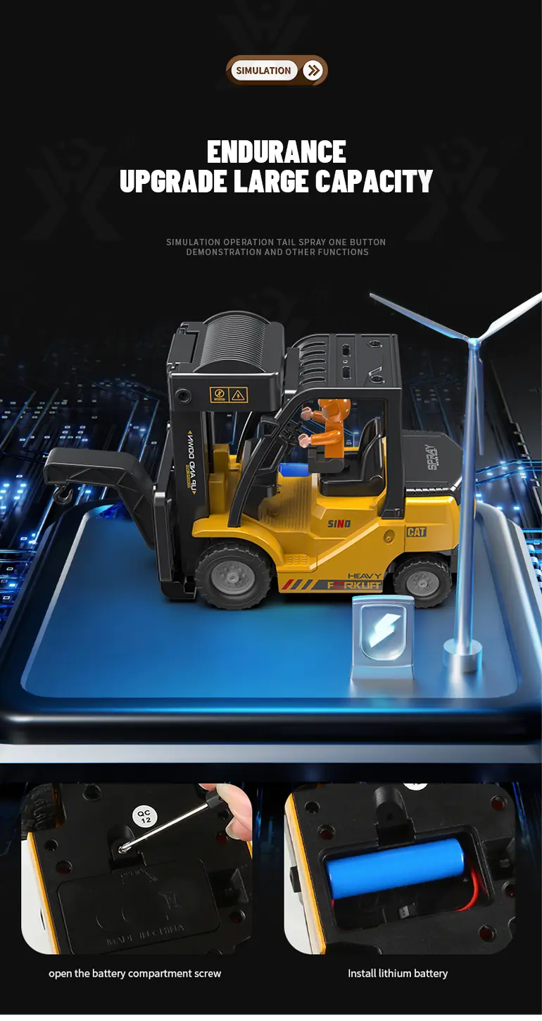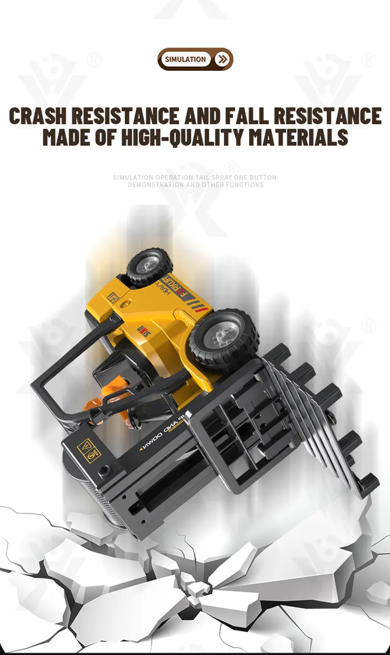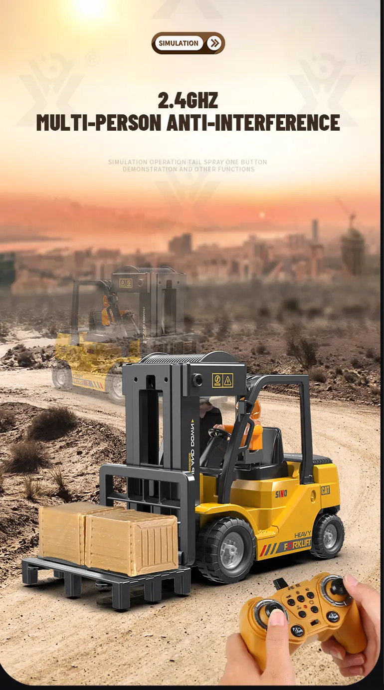 Multi-function RC heavy forklift! Lifting, simulated exhaust spray, sound/light effects & auto-demo. 2.4G remote for realistic operation fun. Chengji RC toy supplier offers you the best quote. Contact us now.