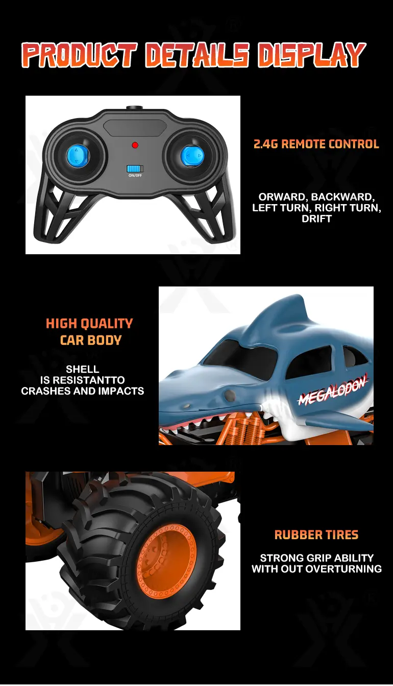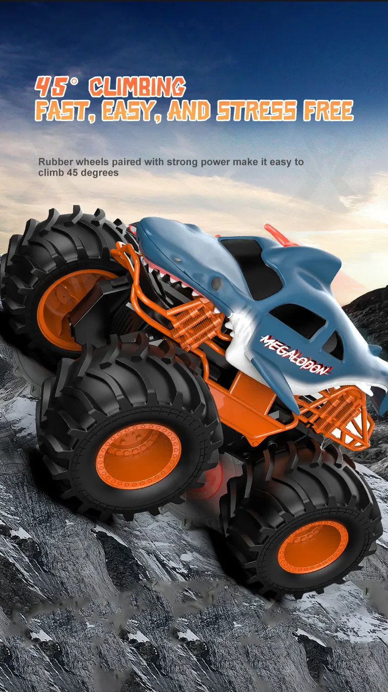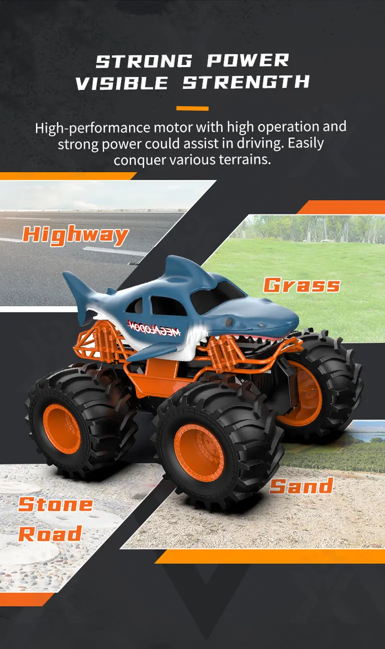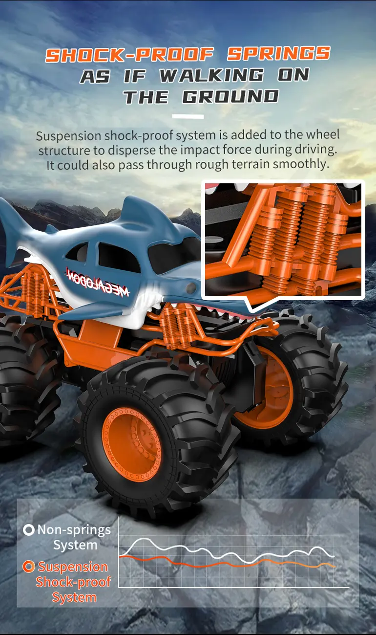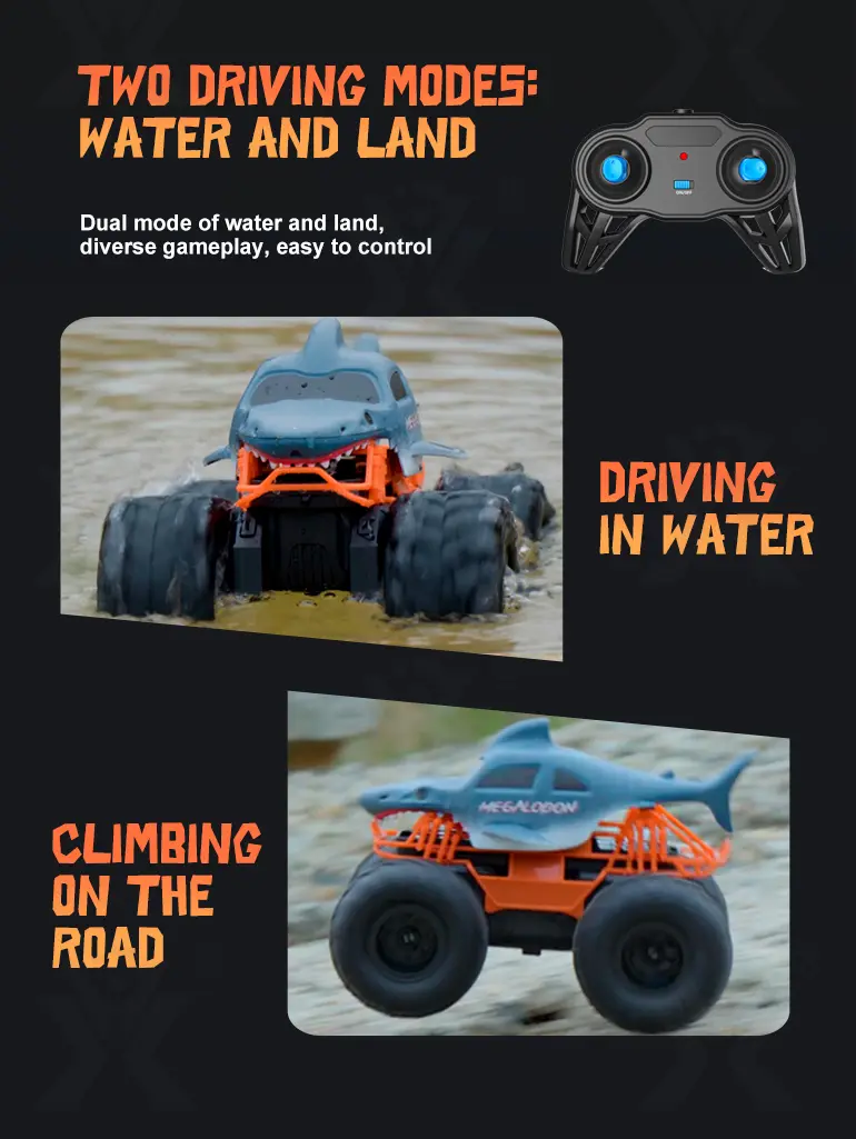 - Waterproof Design for Uninterrupted Water Fun: With a waterproof sealed body, our shark bigfoot amphibious vehicle toy sails directly on water. Enjoy the true amphibious adventure with it.