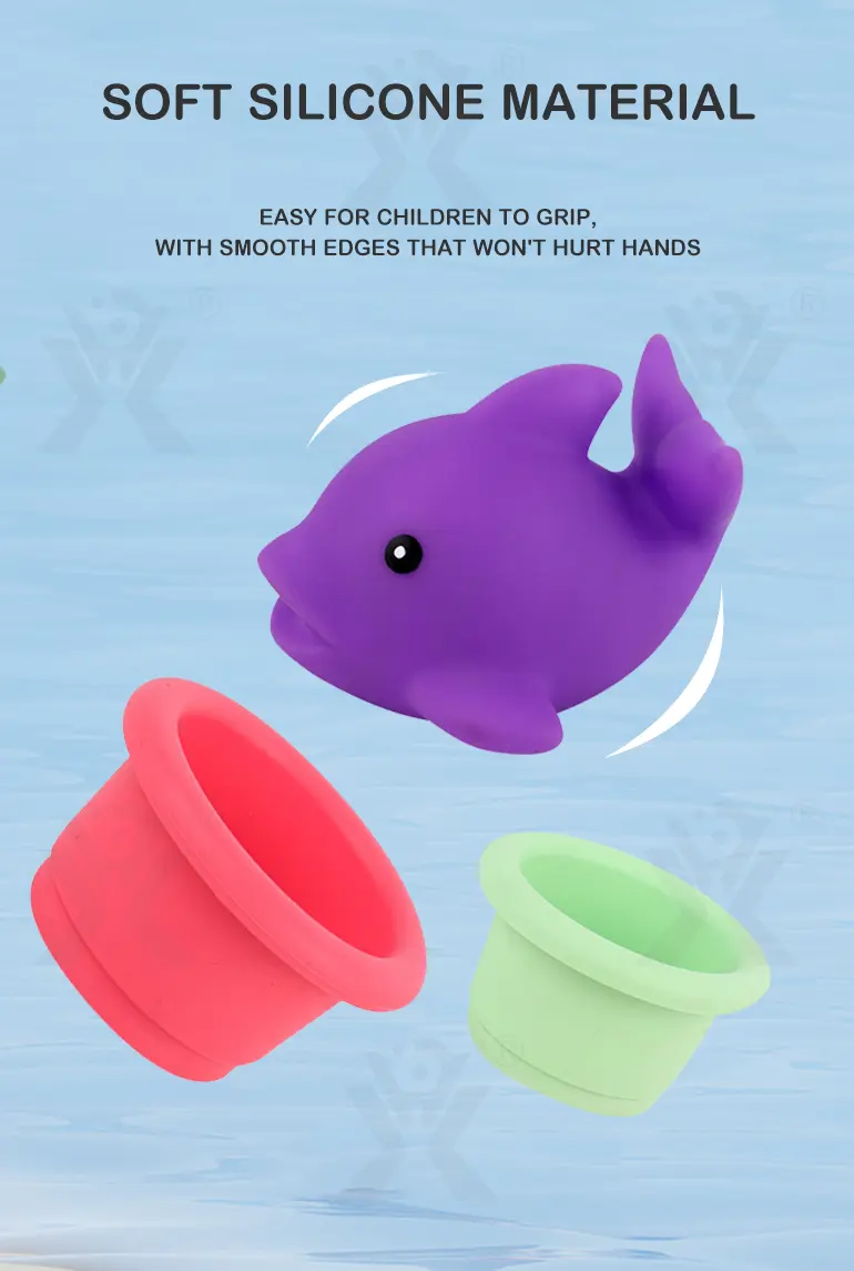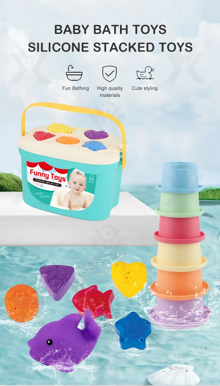 Wholesale stackable baby bath toy, silicone, safe edge. This silicone stacking baby bath toy helps babies develop independent bathing habits through safe materials and shape-matching fun. Supporting procurement. Contact us to get a quote now!