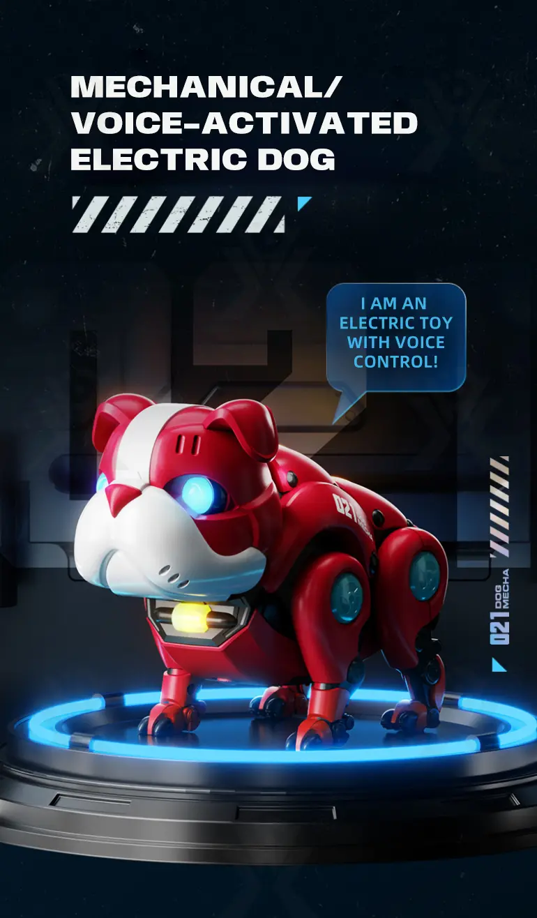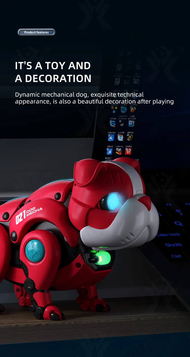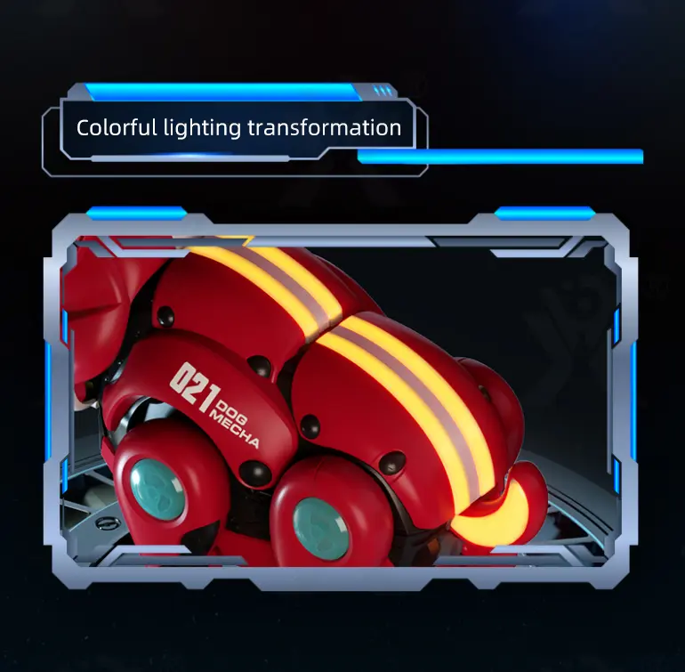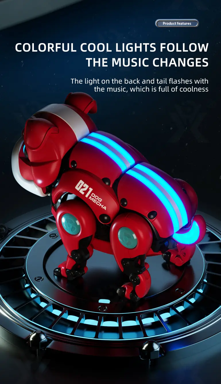 Wholesale smart robot dog toy. It is a mechanical, smart robot dog toy with voice-activated breathing lamp, music sync, robot armor modeling, and clap/sound interaction.