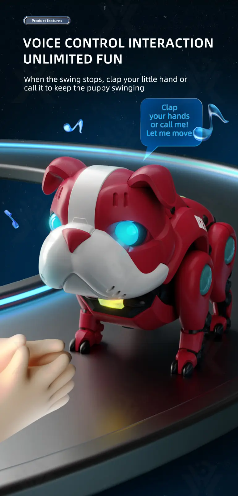 This smart robot dog toy can respond to voice commands and hand claps to start moving and swinging, offering interactive, sensor-based play.