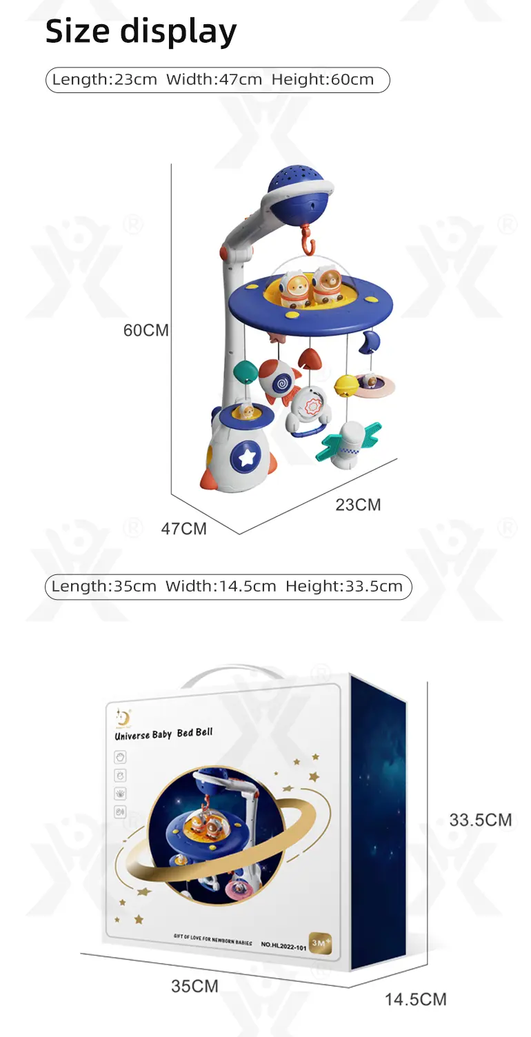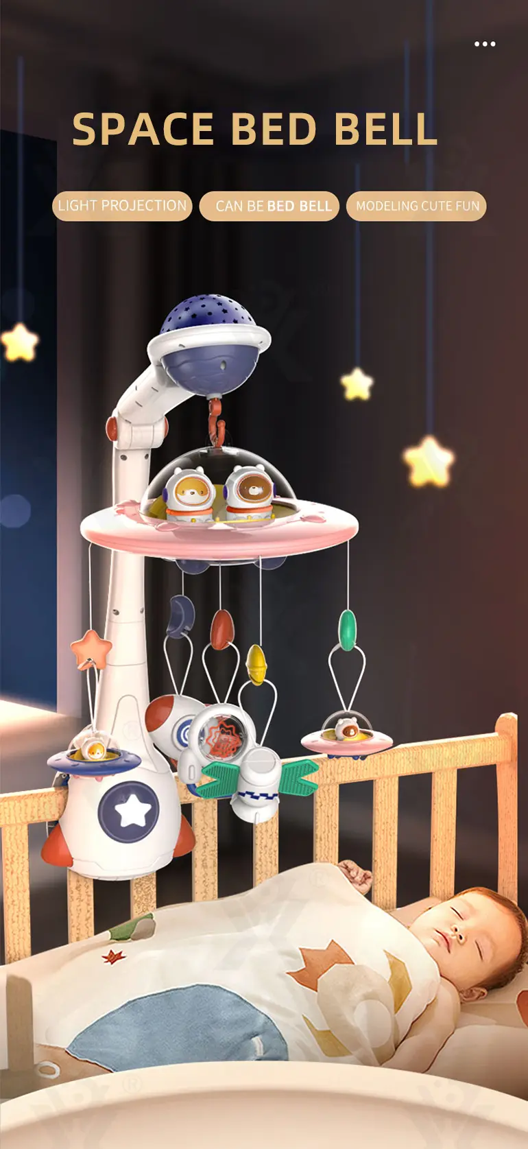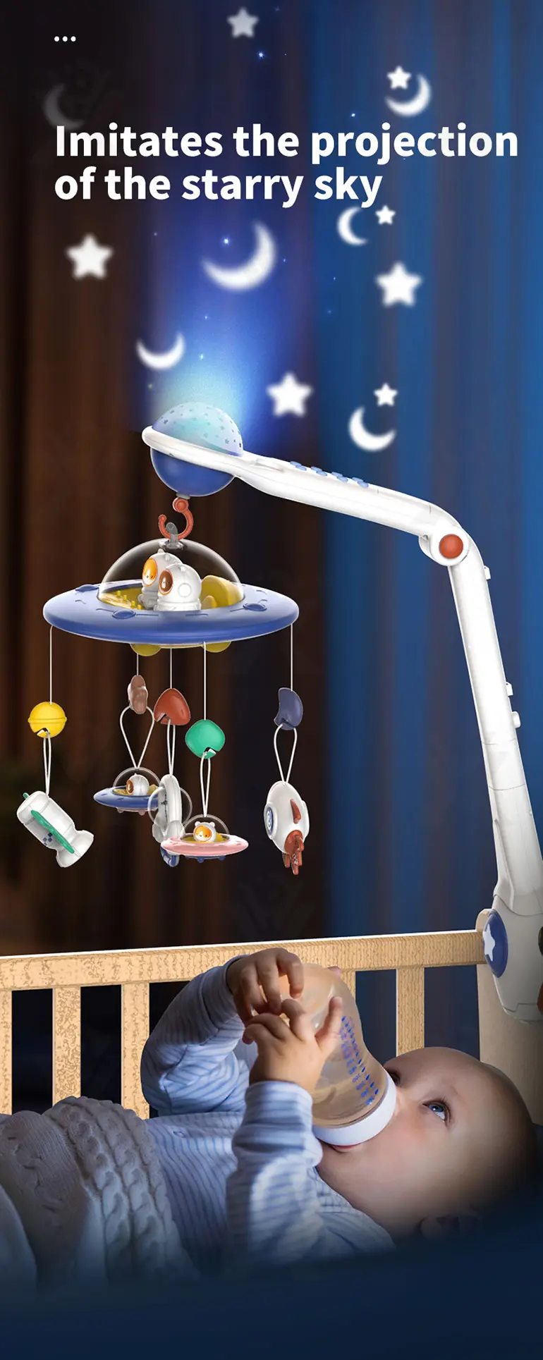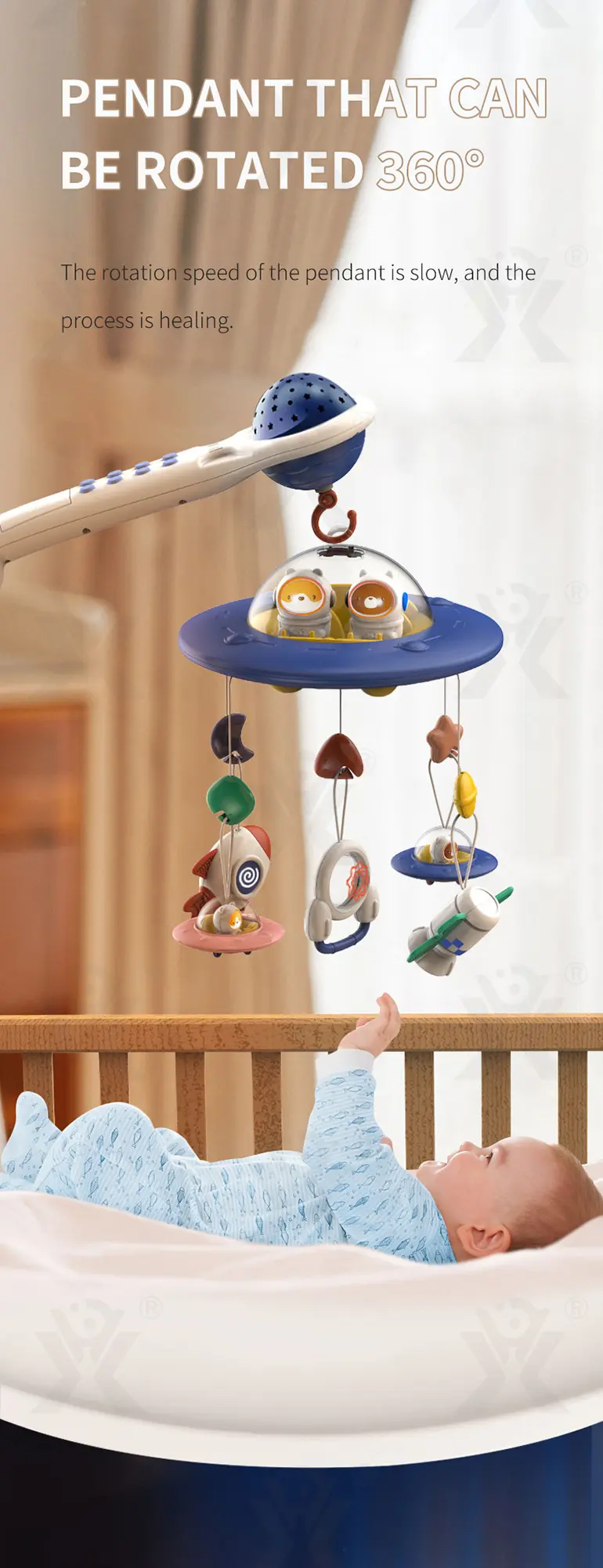 Wholesale Space-themed bed bell with starry projection & 8 soothing functions! 360° rotating pendant, timer shut-off, perfect baby gift. Supporting bulk procurement. Get a quote now!