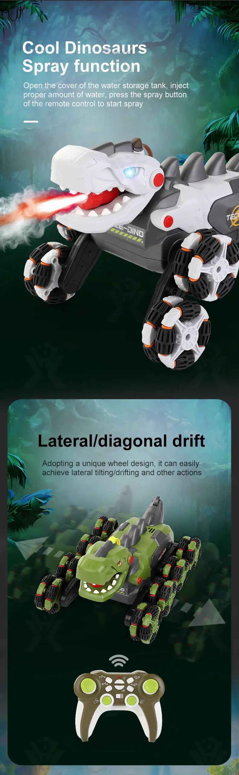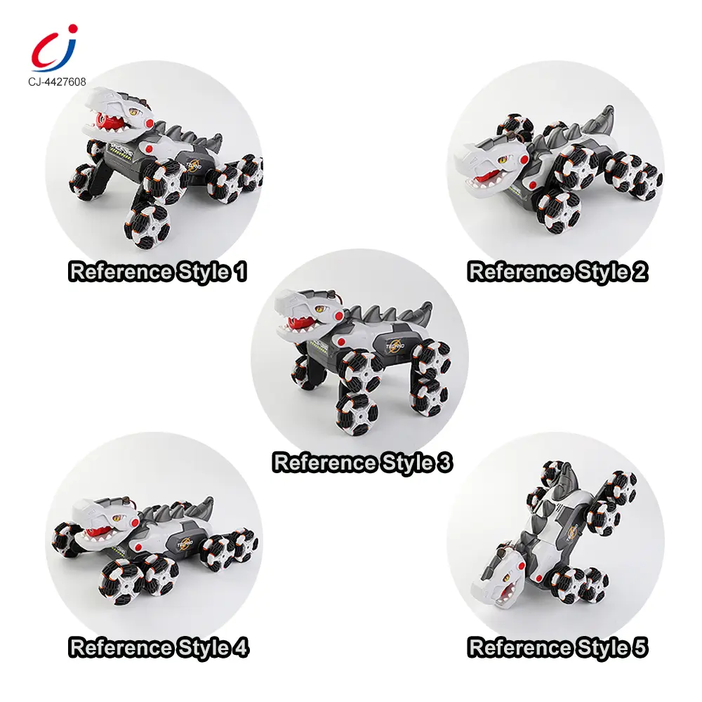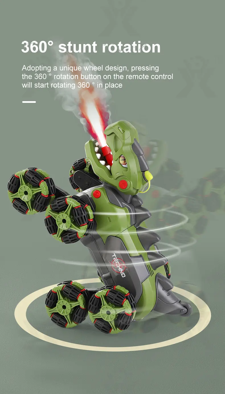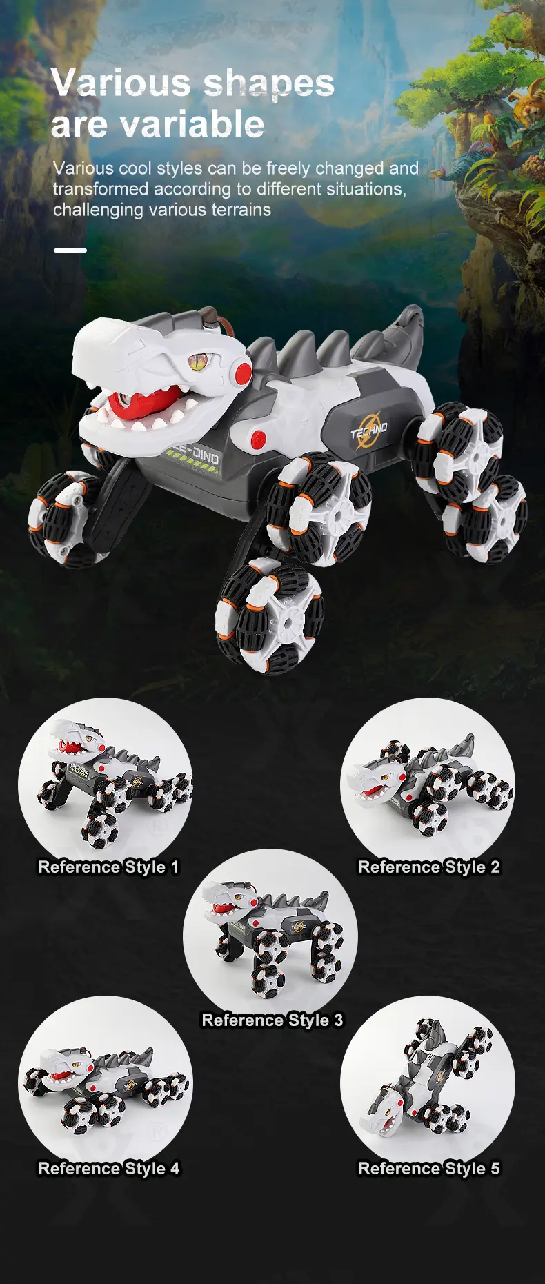 Wholesale eight-wheel stunt dinosaur car with water spray, 360° drift, cool LED lights, multiple transformable styles, and remote control action.