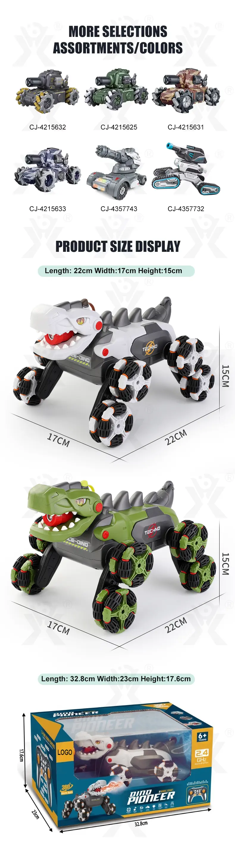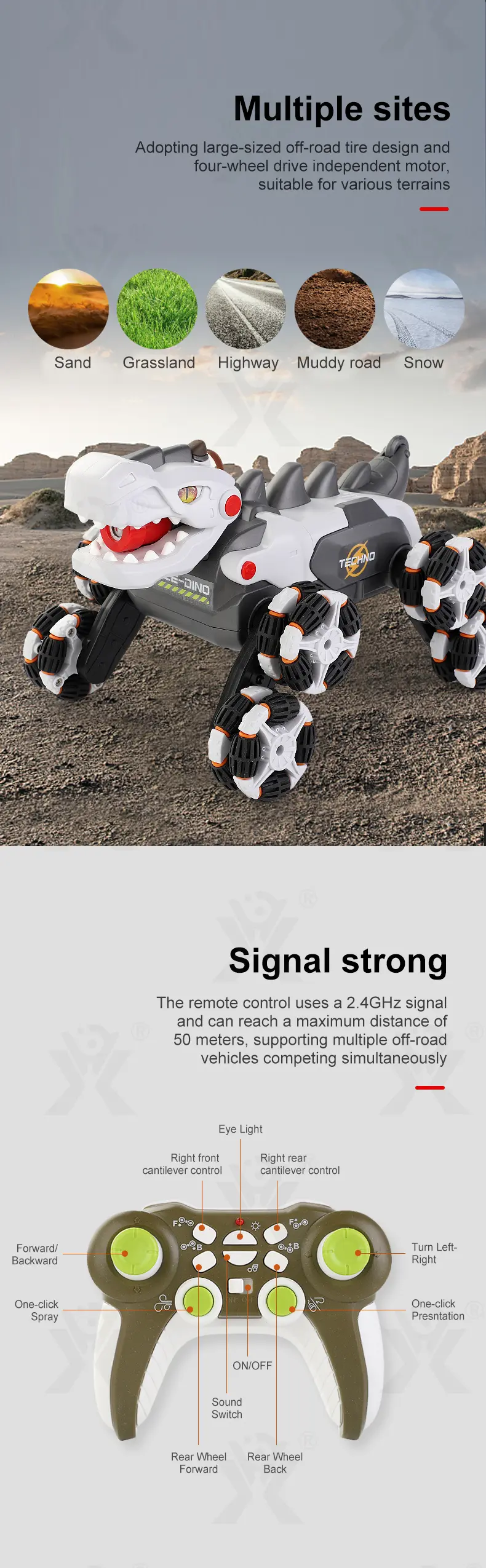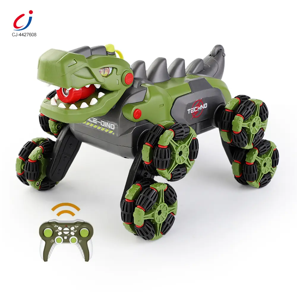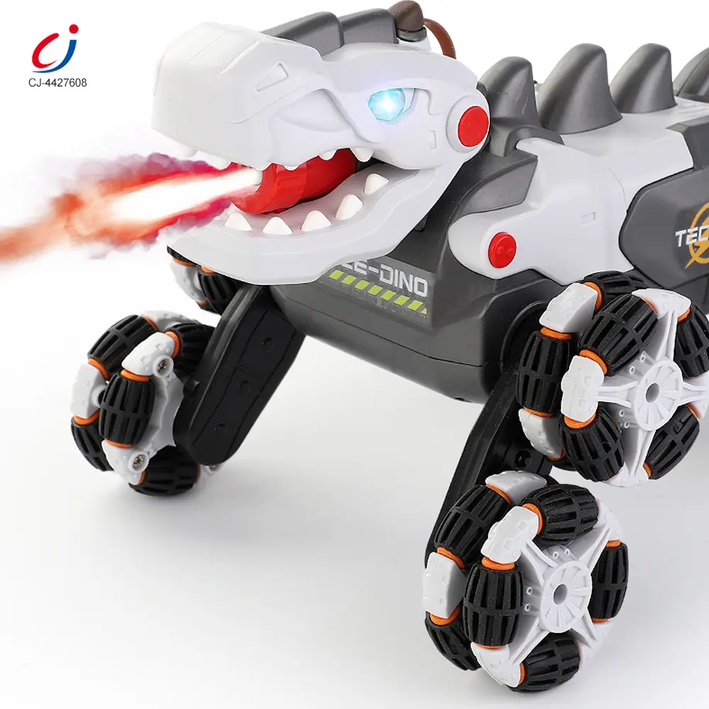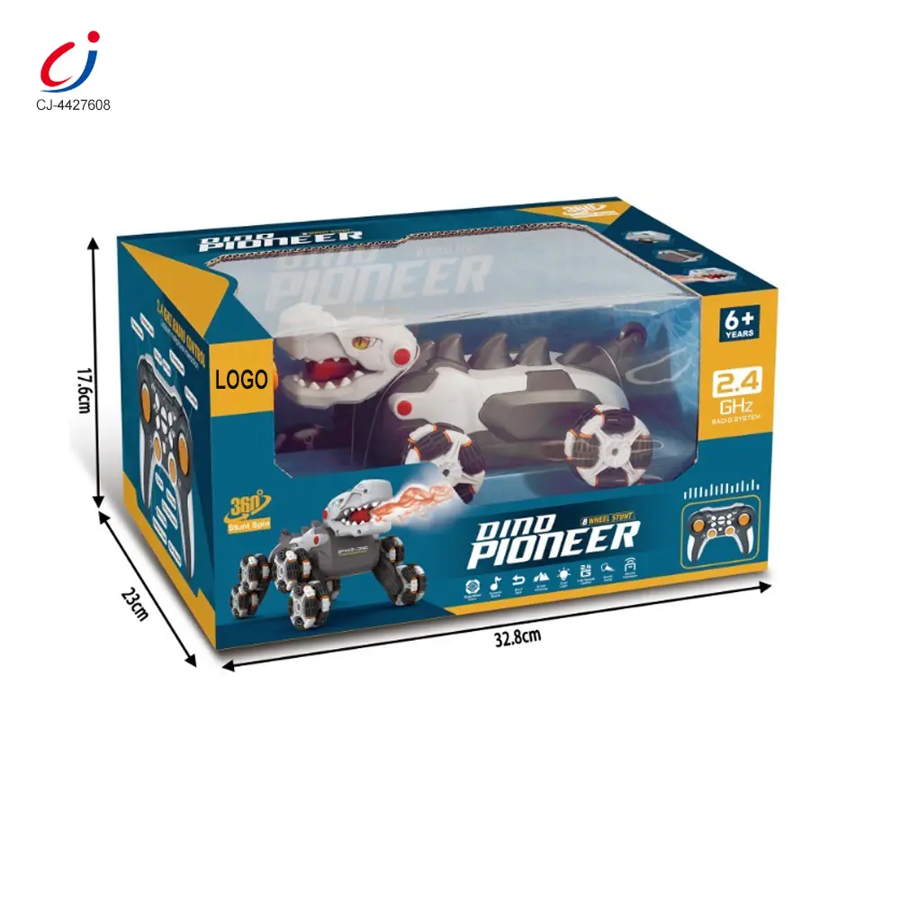 Wholesale eight-wheel stunt dinosaur car with water spray, 360° drift, cool LED lights, multiple transformable styles, and remote control action.