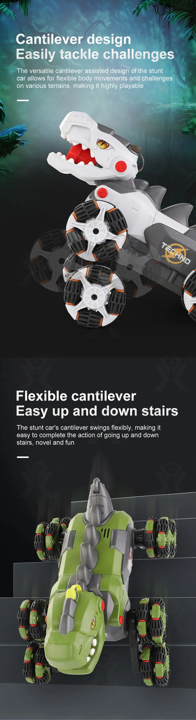 Our wholesale stunt dinosaur car toy features a unique wheel design that allows smooth sideways, diagonal, and full-circle drifting for dynamic stunts.