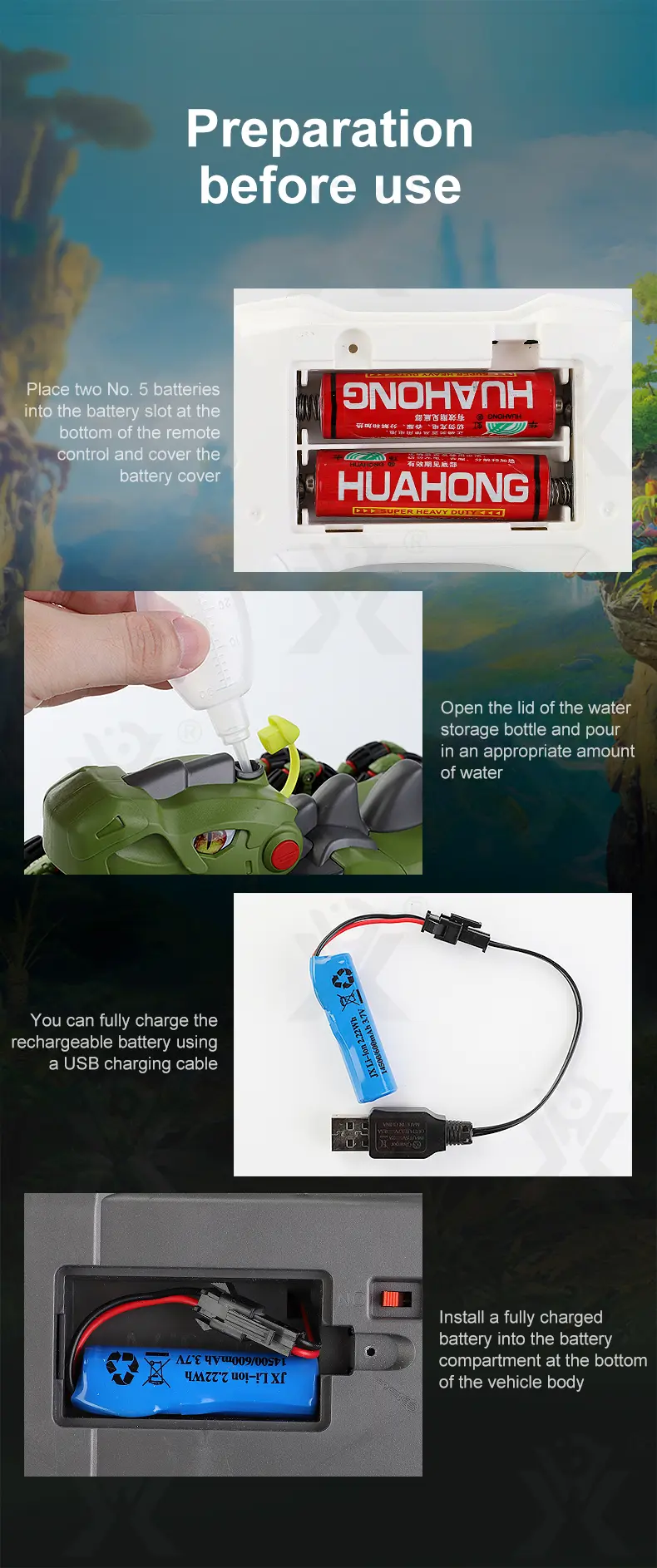 Fill the water tank and press the remote button to spray water, adding exciting interactive play.