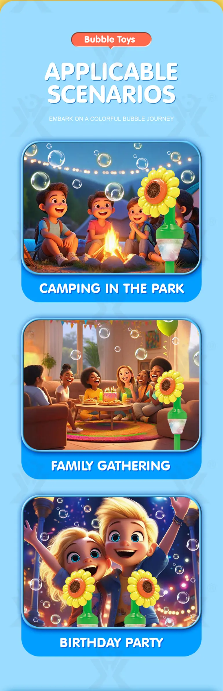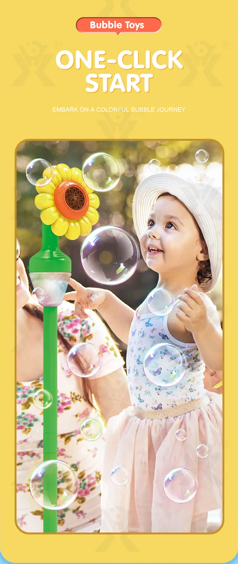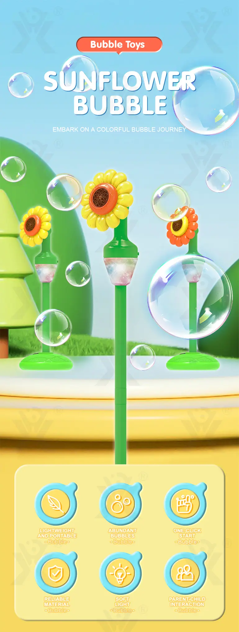Wholesale sunflower bubble machine toy. Sunflower bubble machine with one-click start, optional remote control, portable build, soft lights, and fun for parties and outdoor play.