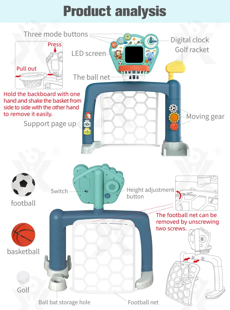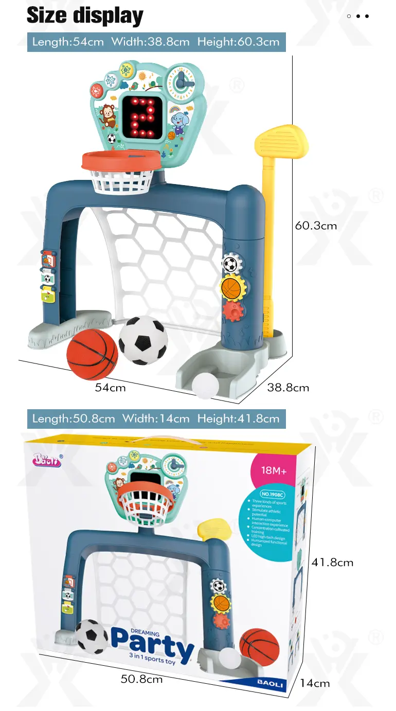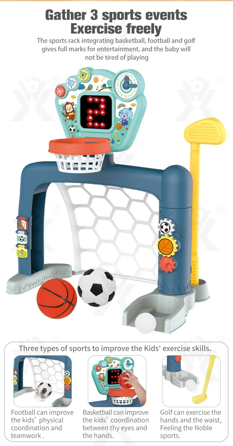 Wholesale toddler sports center toy. This toddler sports center toy combines soccer, basketball, and golf together, aiming to provide kids a all-in-one sport stations, which is great for kids’ development.