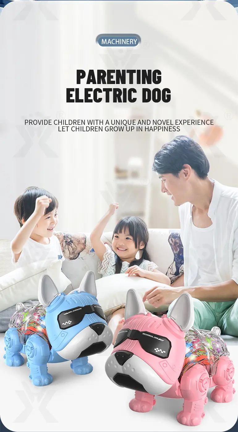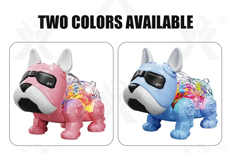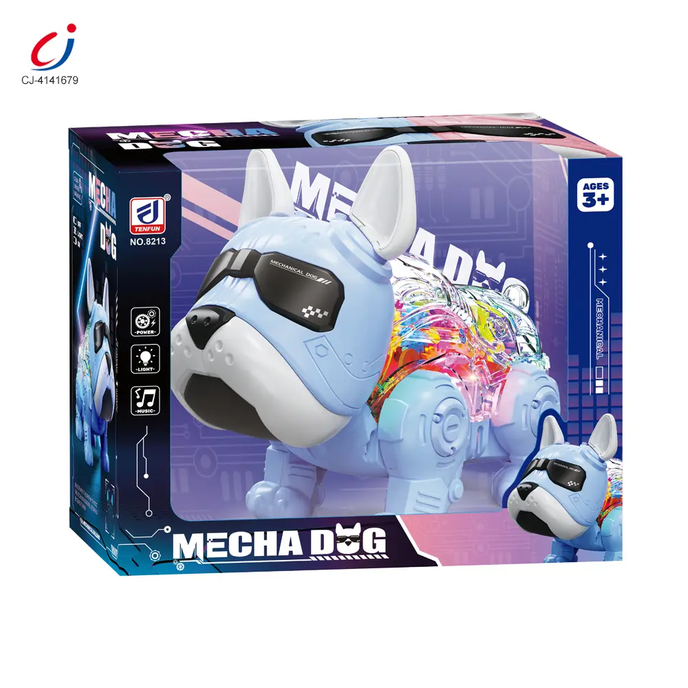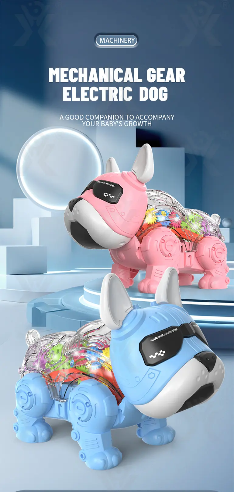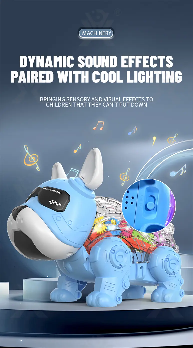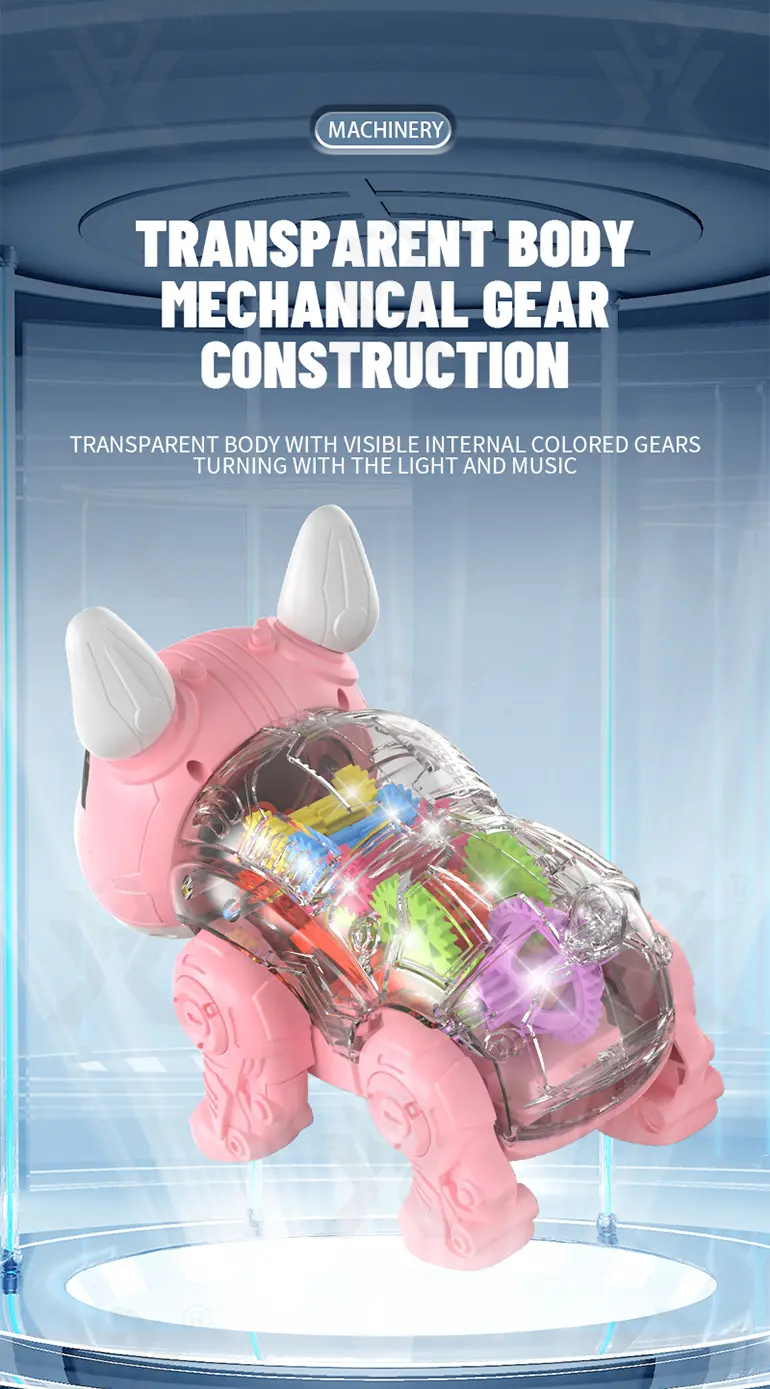 Wholesale walking robot dog. It features transparent gear with visible spinning gears, lights & music—electric walking & drop-proof for lasting STEM fun.
