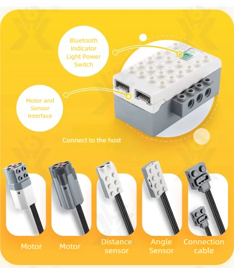 - Bluetooth Remote Control & Sensors: It includes Bluetooth connectivity, motor and sensor interfaces (distance, angle), and indicator lights for interactive tech learning.