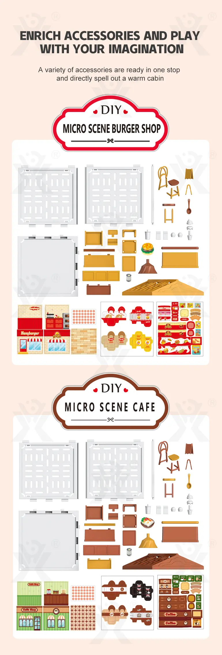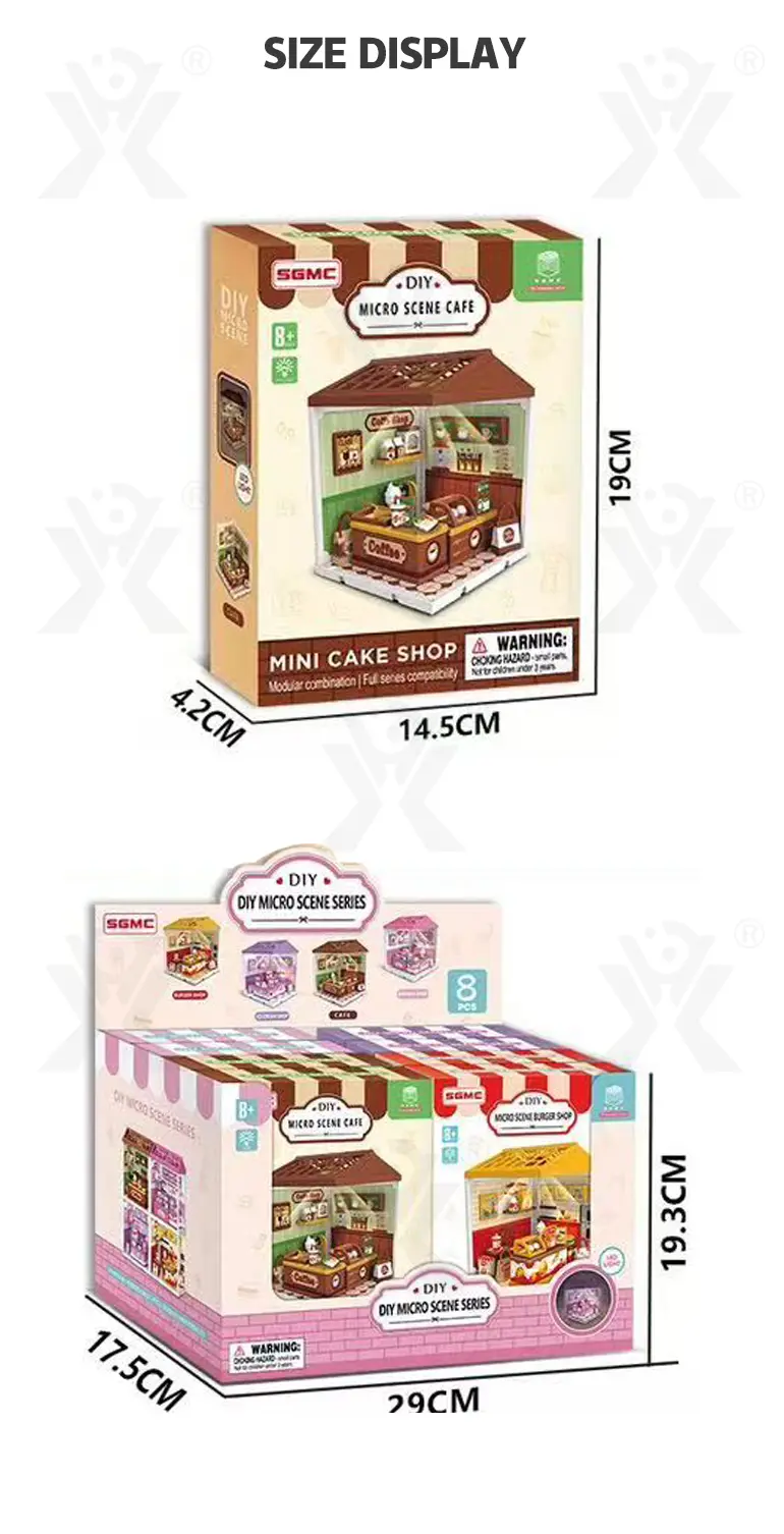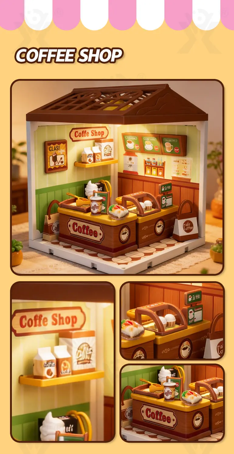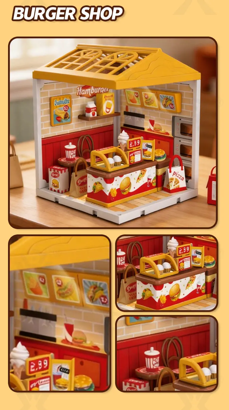 The DIY micro scene store kit includes ambient lighting that brings your micro scene to life after dark. When illuminated, the coffee shop and hamburger store glow with a warm, inviting light. “Bring your own warm night atmosphere up” – the soft lighting highlights every detail, creating a cozy miniature world that doubles as a night light or evening display piece. -