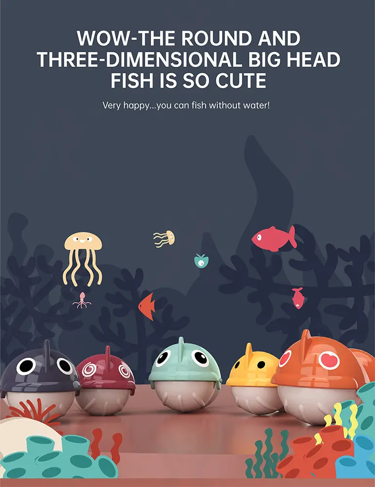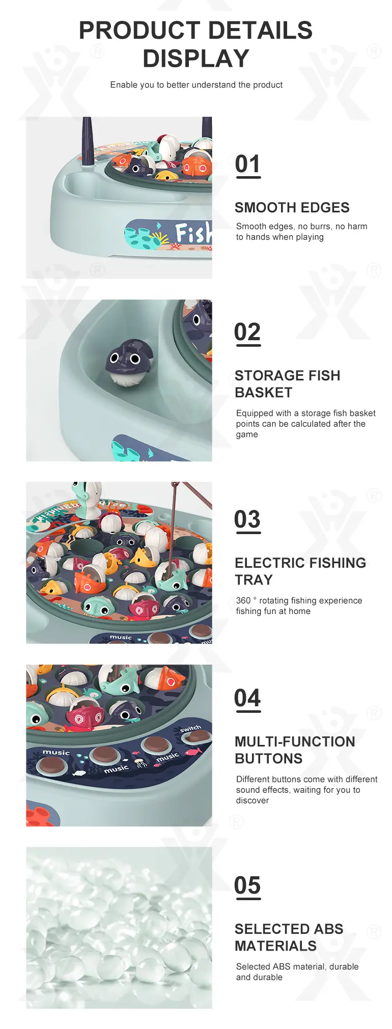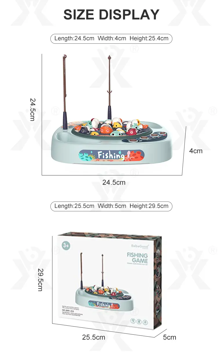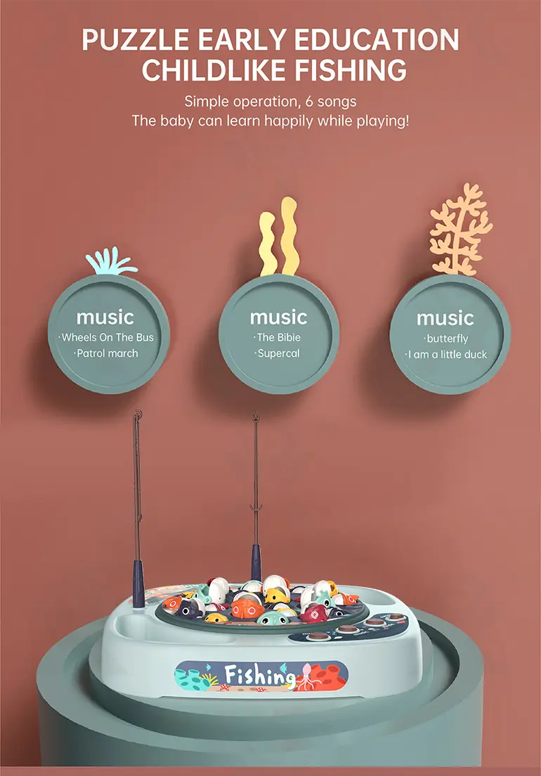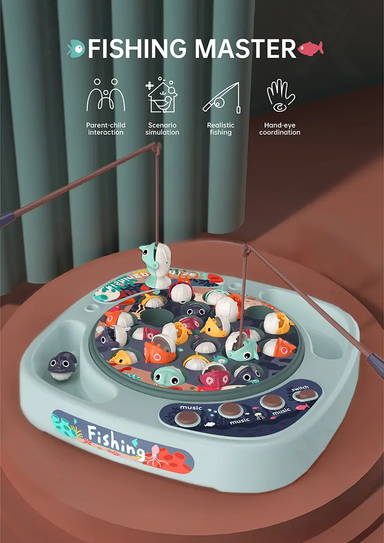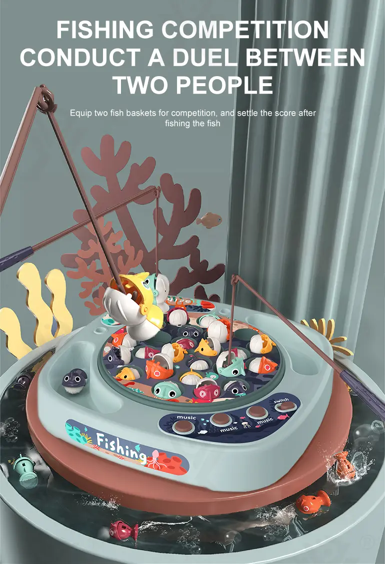 Wholesale electric fishing game set, 360° rotating fishing tray, water-free play, cute 3D big fish, storage basket scoring, multiple sound buttons, smooth, safe material.