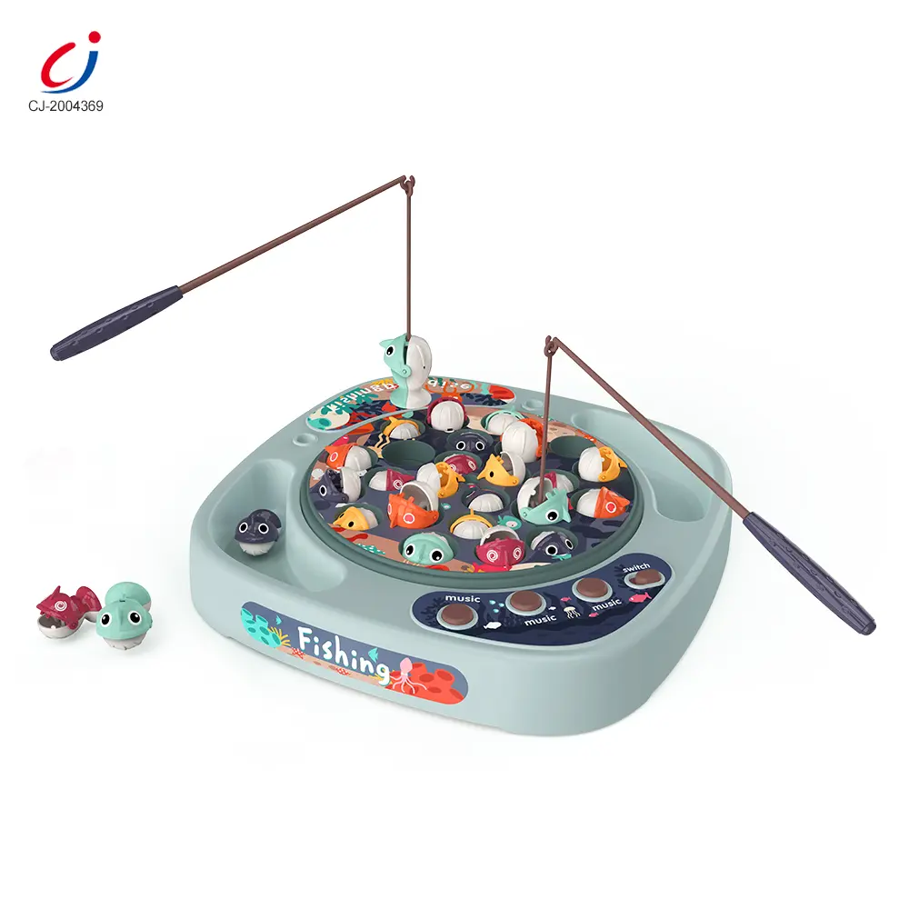 Wholesale electric fishing game set, 360° rotating fishing tray, water-free play, cute 3D big fish, storage basket scoring, multiple sound buttons, smooth, safe material.
