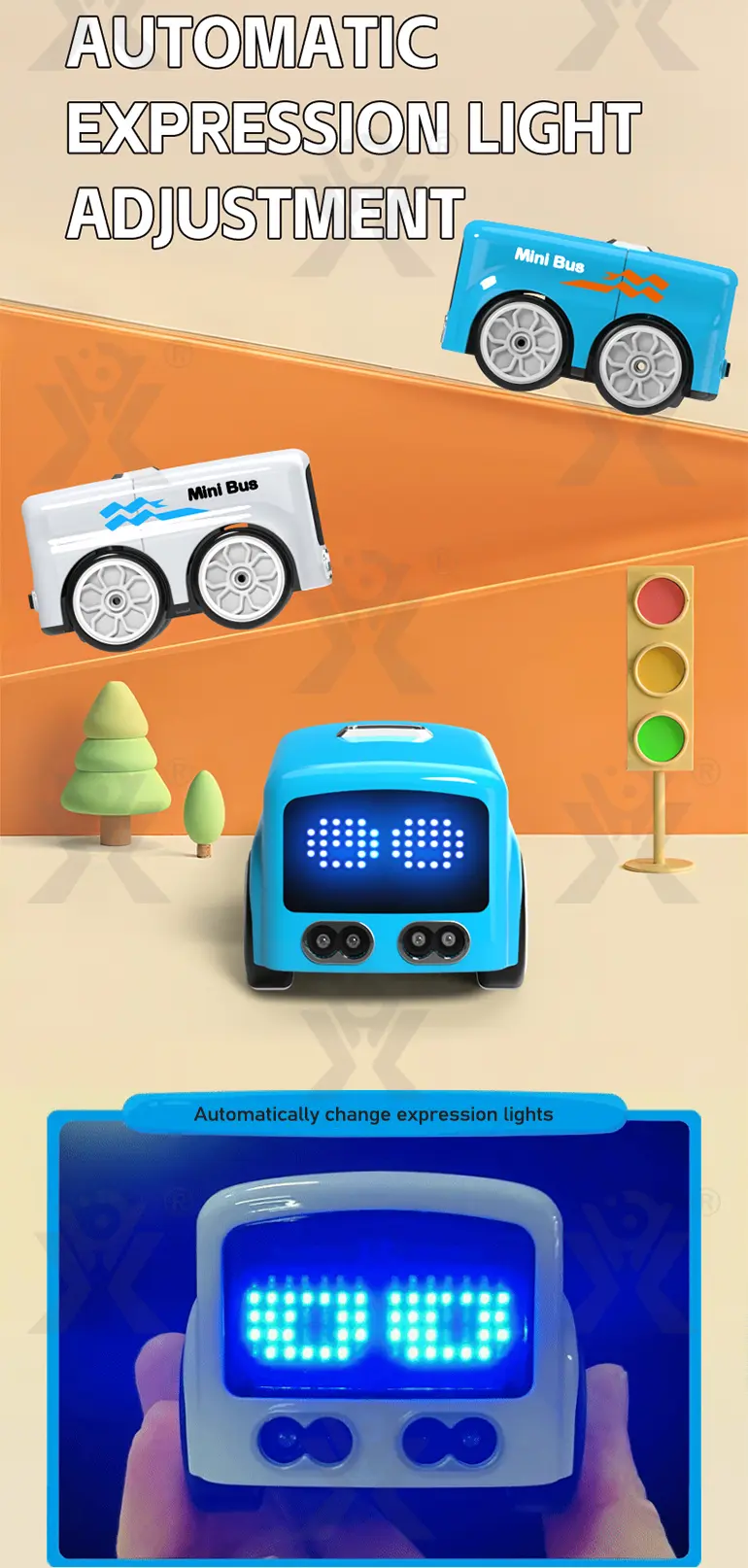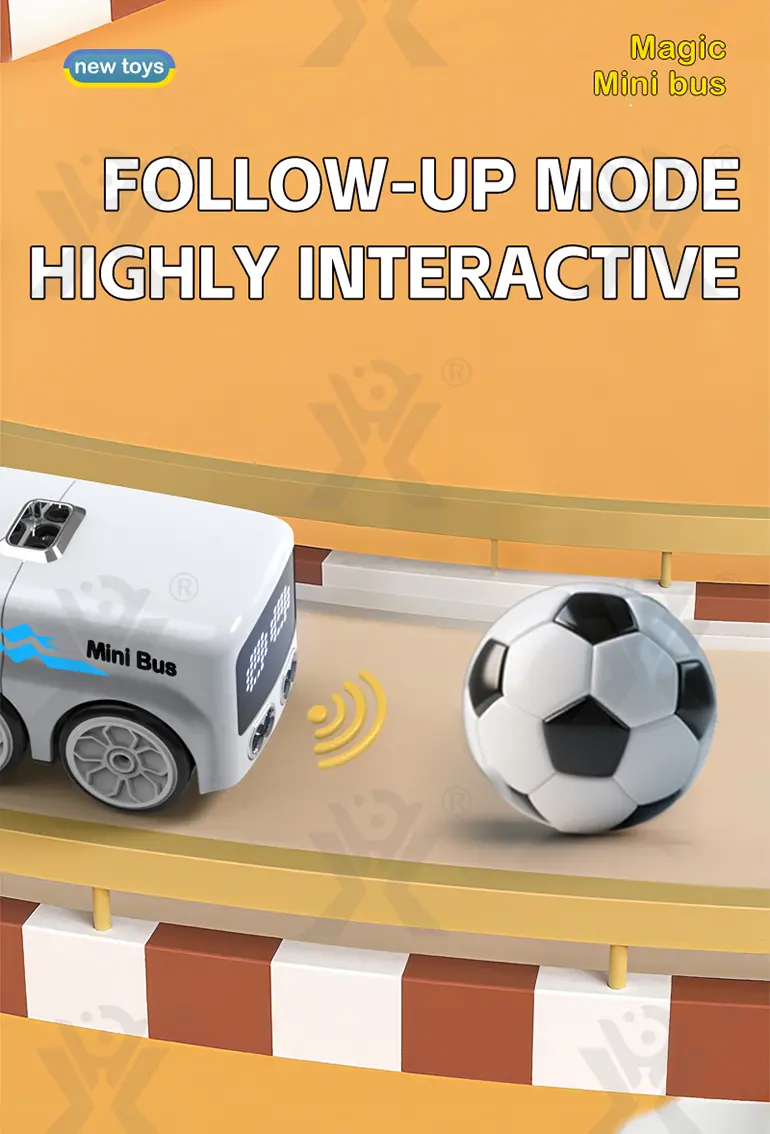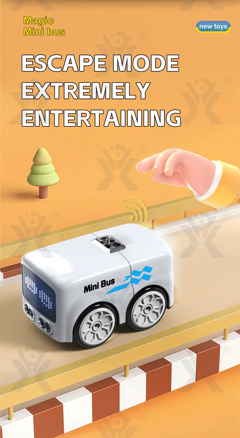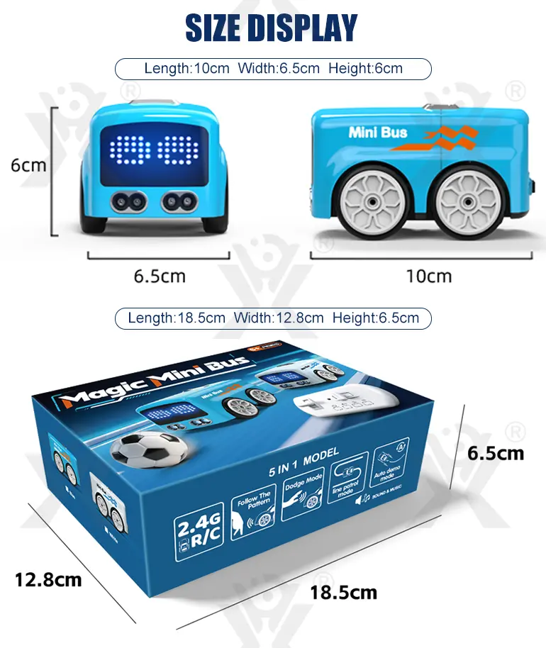 Wholesale RC mini bus, follow/escape/patrol/demo 4 modes, remote control, music playback, smooth burr-free shell, interactive toy for kids to have great fun.