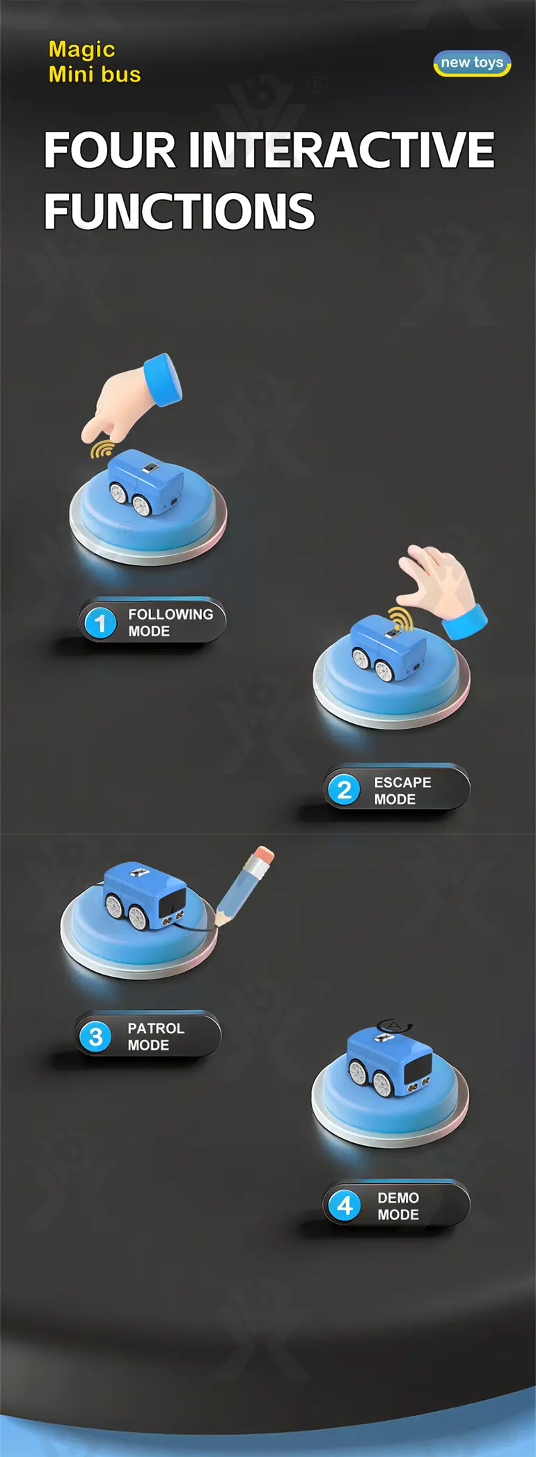 One car, four ways to play! Follow me, run away, patrol the room, or watch the demo—endless interactive fun for curious kids. -