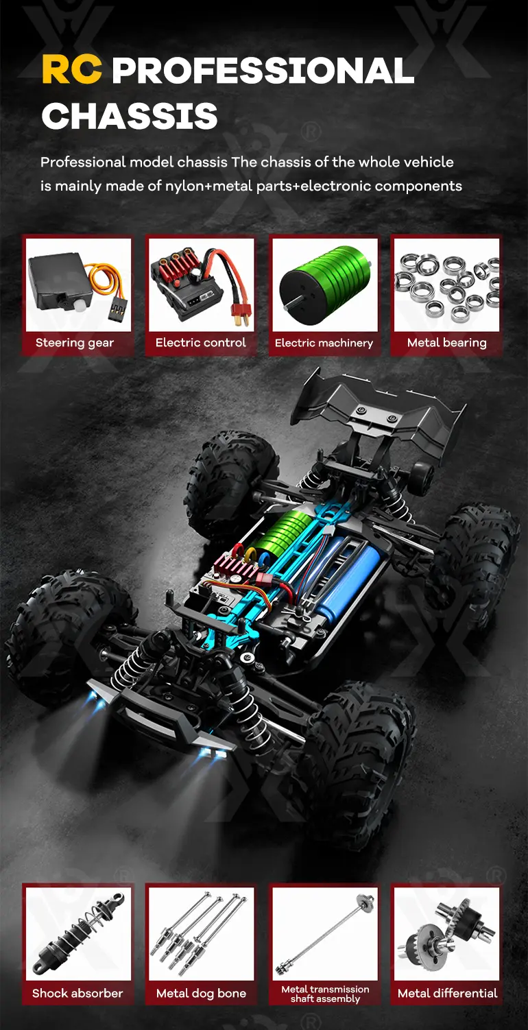 Wholesale RC off-road stunt car toy. 1:16 scale electric 4WD RC car with 2840 brushless motor, 6 metal reinforcements, LED lights, and professional chassis for high performance.