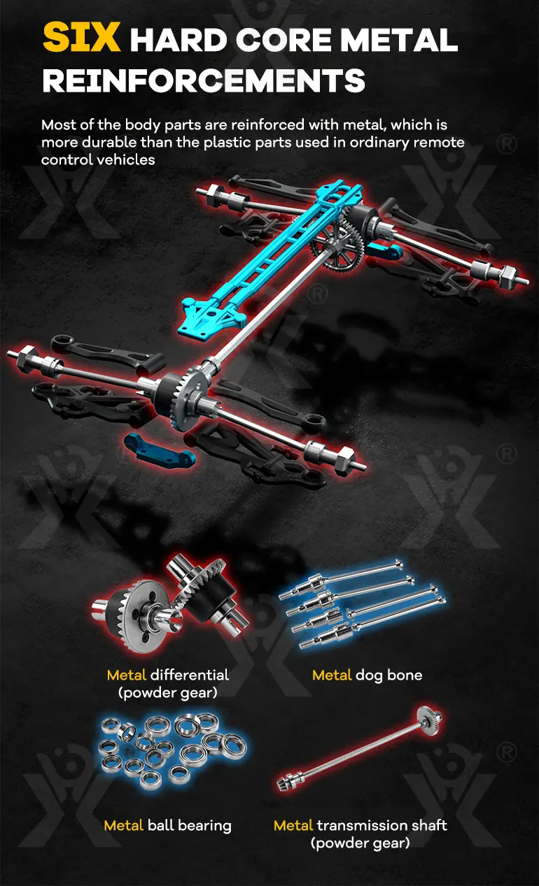 This off-road stunt car toy enhances durability and strength with an upgraded metal differential, drive shaft, dog bone, bearings, and transmission.