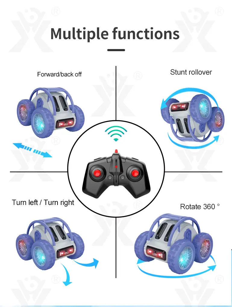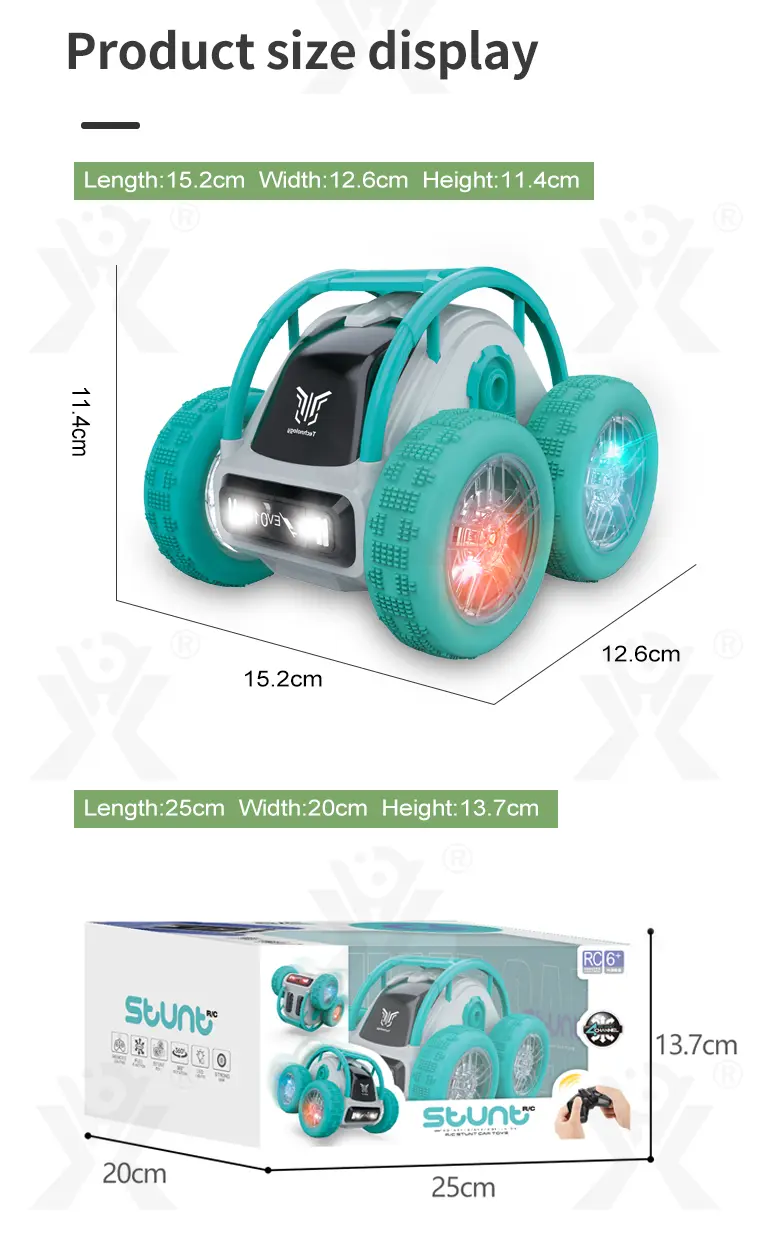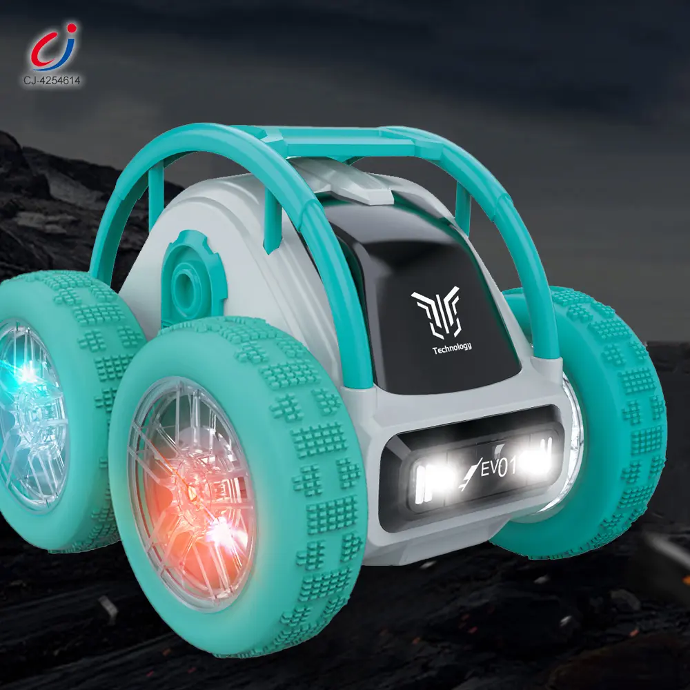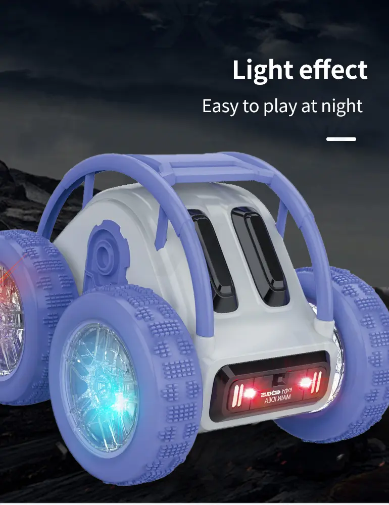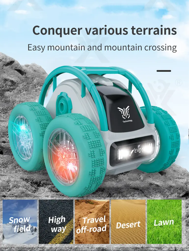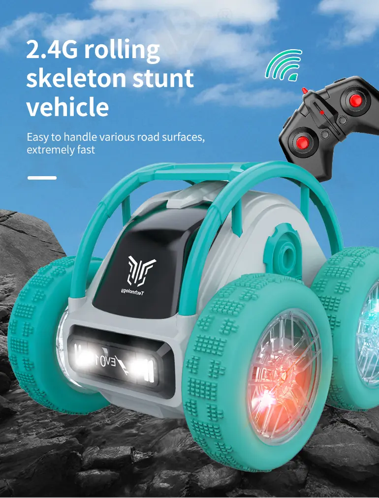 Wholesale rolling skeleton stunt car with 2.4GHz remote control, 360° flips, high-speed drift, all-terrain tires, cool LED lights, and strong power for off-road fun.