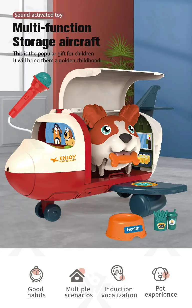 Wholesale sound-activated storage aircraft toy! This toy features a built-in microphone, an interchangeable pet tongue & kitchen accessories. It helps develop language skills & tidy habits. Supporting bulk orders. Contact us now!