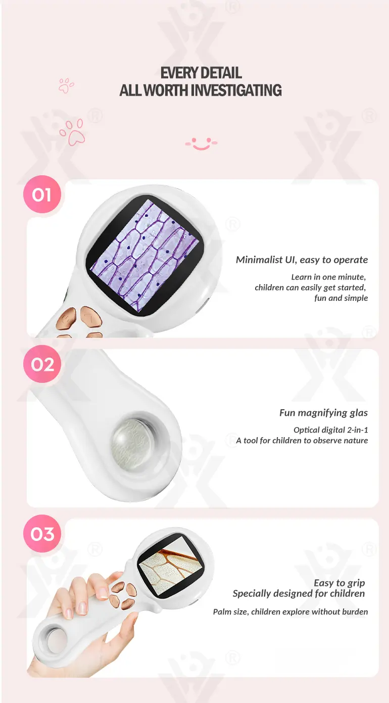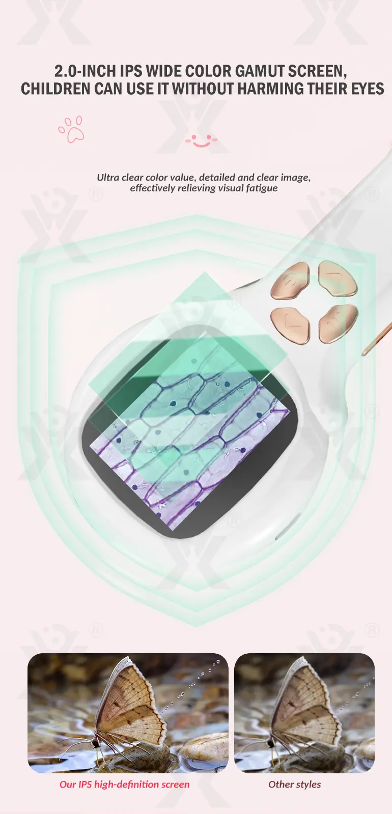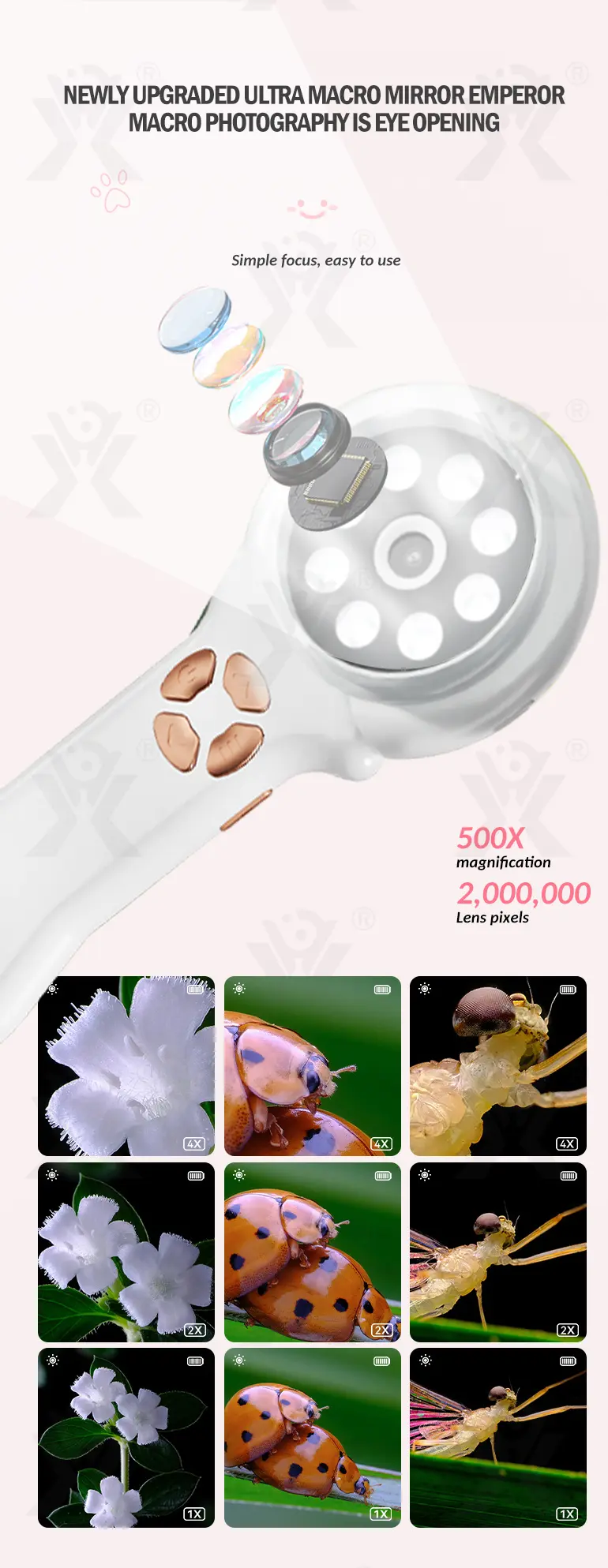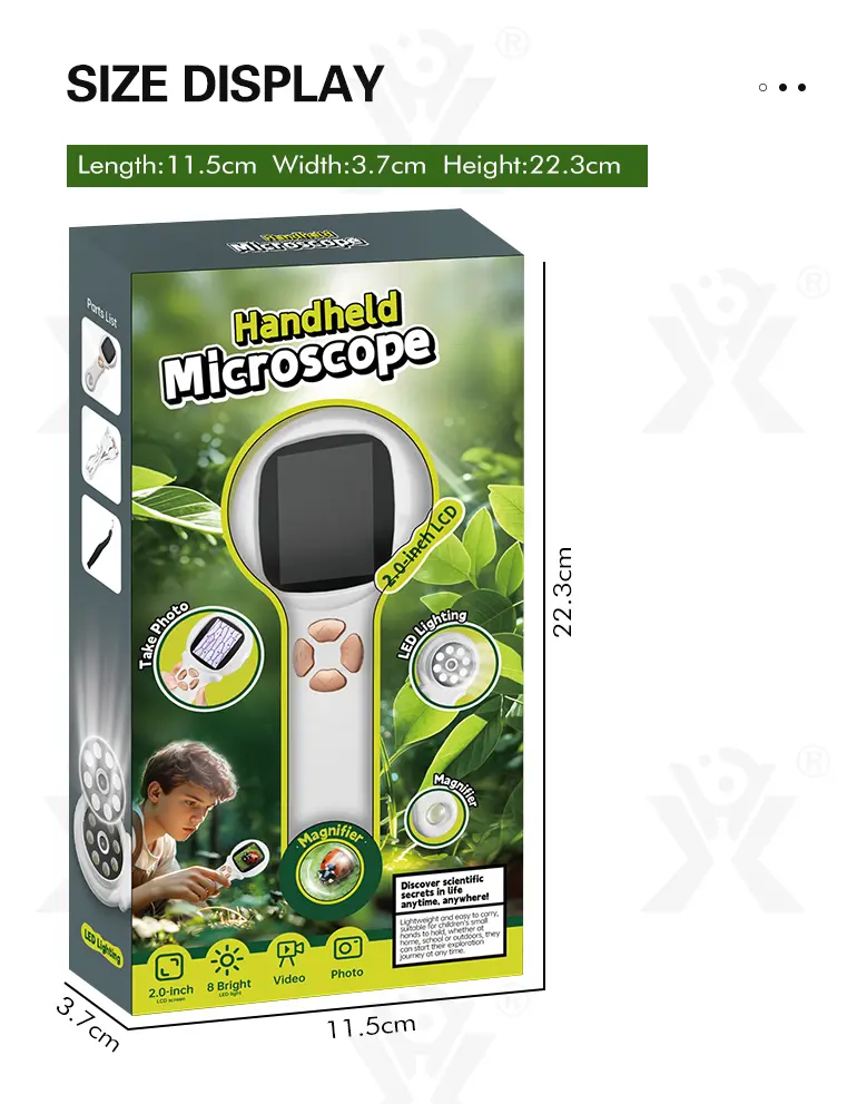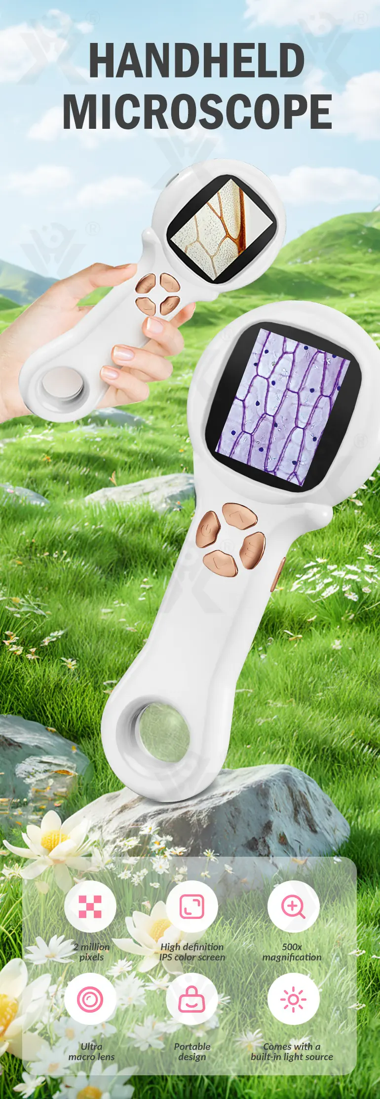 Wholesale handheld digital microscope toy. This handheld mini microscope features 2MP, 500X magnification, 2.0″ IPS eye-care screen, photo & video recording, built-in light, portable, and explore the micro-world.
