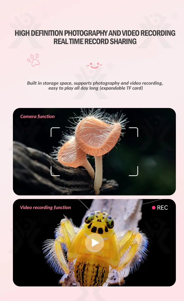 Built-in storage (expandable via TF card) lets kids snap photos and record videos of their findings—share amazing close-ups with friends and family! -