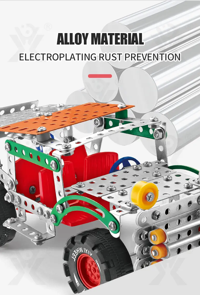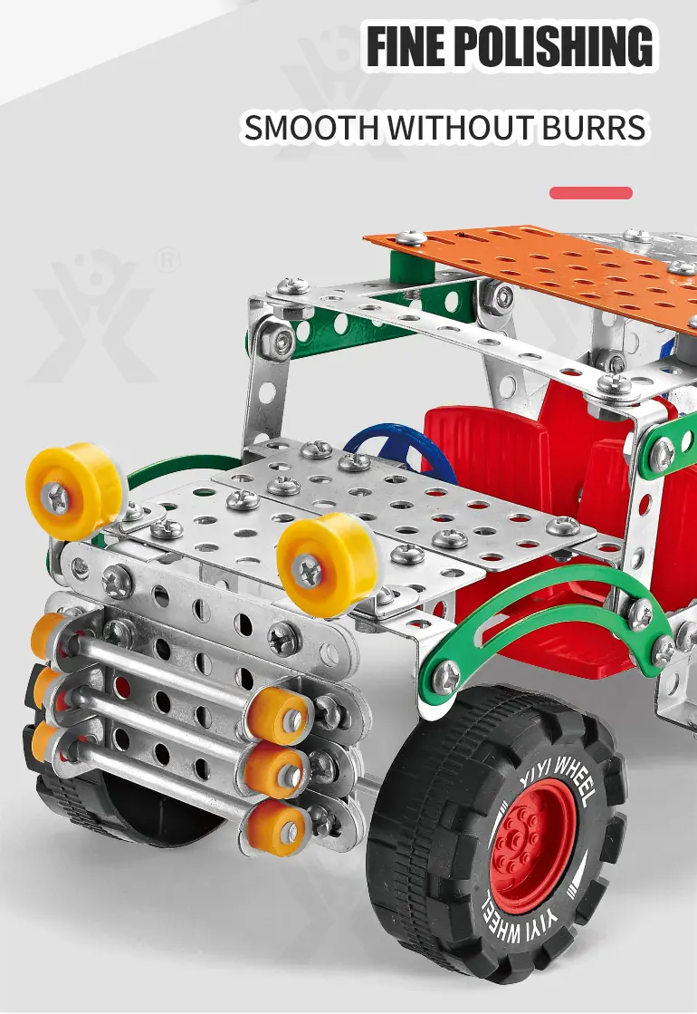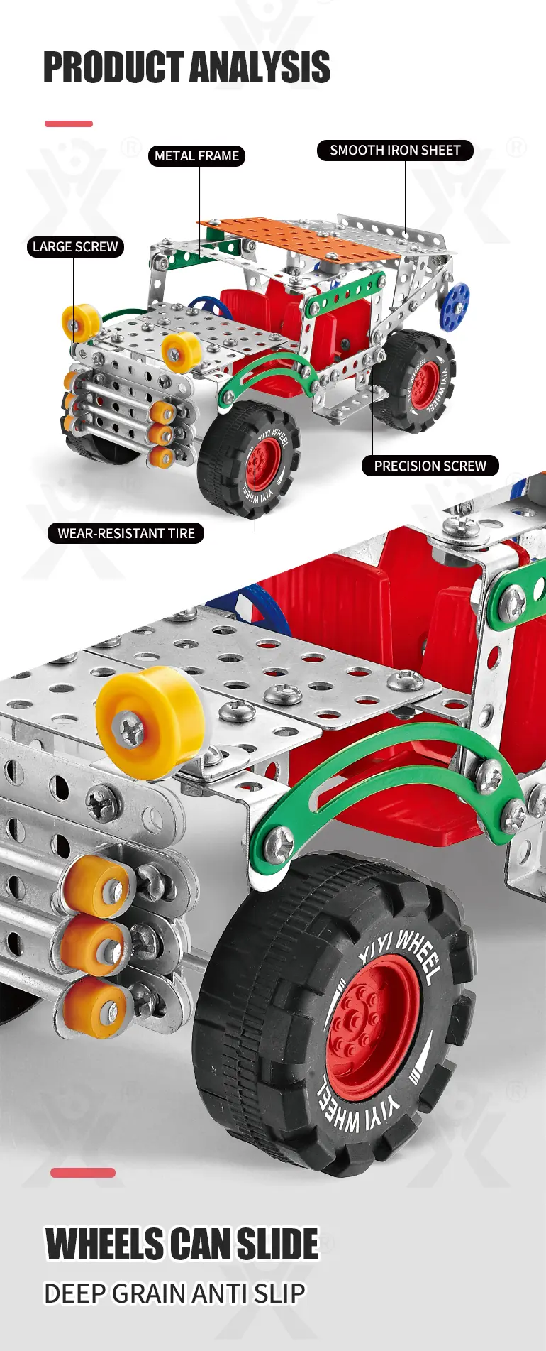 The metal frame provides structural integrity, while smooth iron sheets form the body panels. Large and precision screws are included for different assembly needs—larger screws for structural connections, smaller precision screws for detailed parts. This variety introduces children to different fastener types and their appropriate uses. Wheels can slide after assembly, confirming correct construction. A truly hands-on engineering experience.