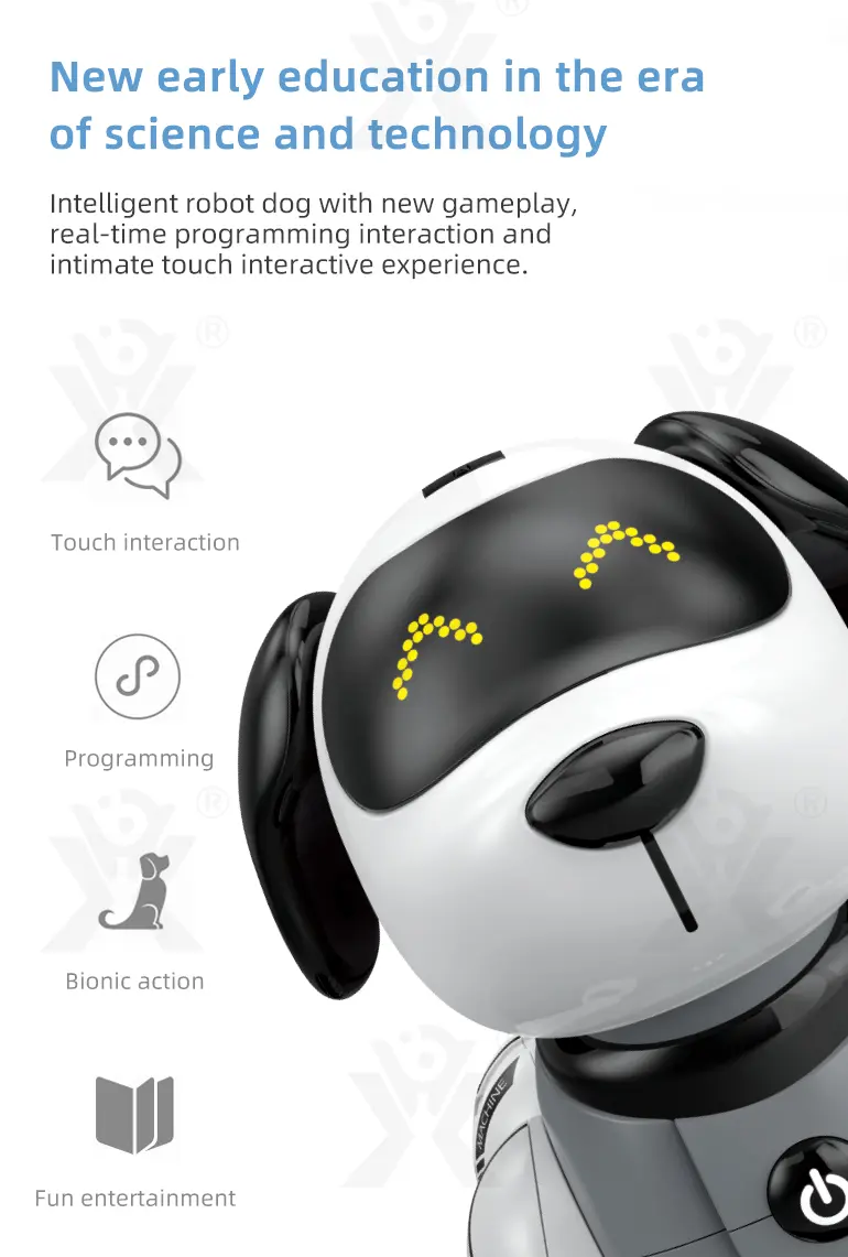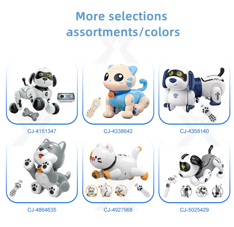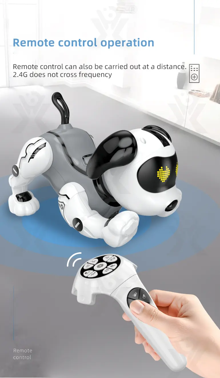 Wholesale RC smart dog toy. This AI smart dog features gesture sensing, touch interaction, bionic movement, real-time programming, and sound imitation for tech education fun.