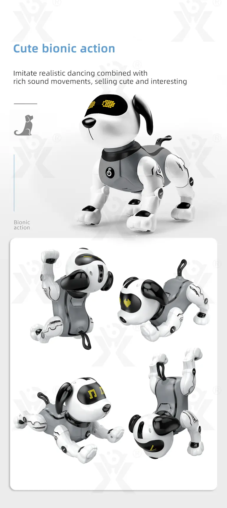 This RC smart dog toy imitates dog sounds, meows softly, plays music, and offers voice feedback for engaging auditory interaction.